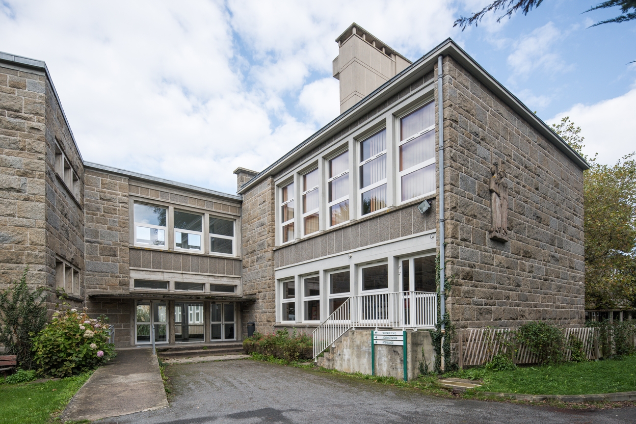 Détail sur l'entrée de la galerie de liaison entre les bâtiments B1 et B2 (externats), côté sud. Louis Arretche, architecte. Sur le mur pignon, bas-relief d'Antoniucci Volti.Immatriculation