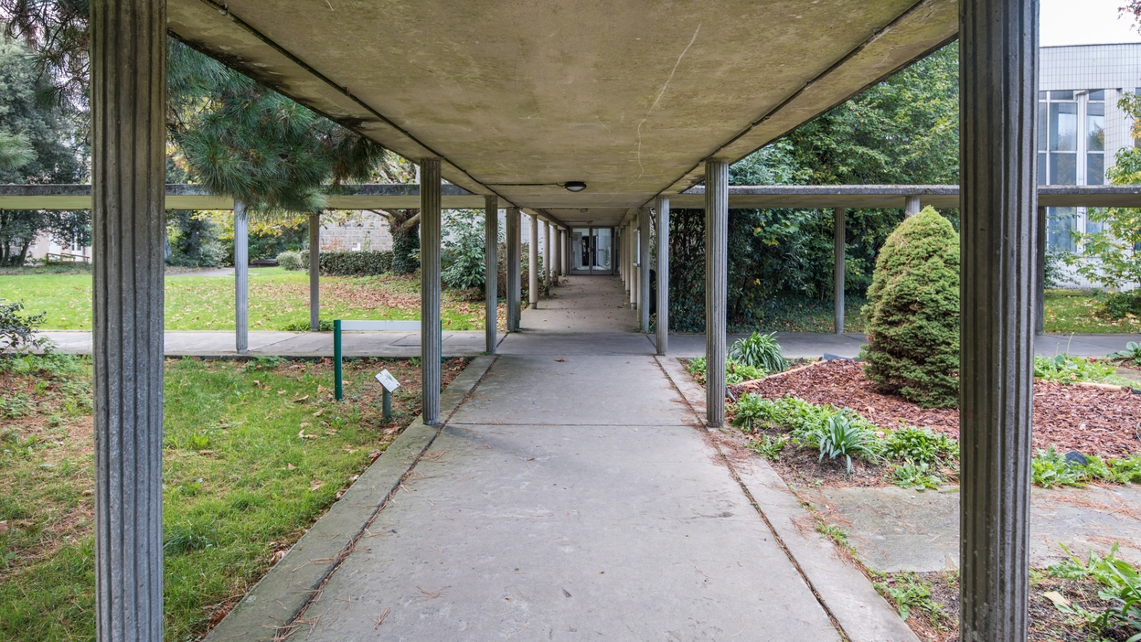 Croisement de galeries de circulation extérieures. A l'arrière plan, l'une des entrées du bâtiment B2.Immatriculation