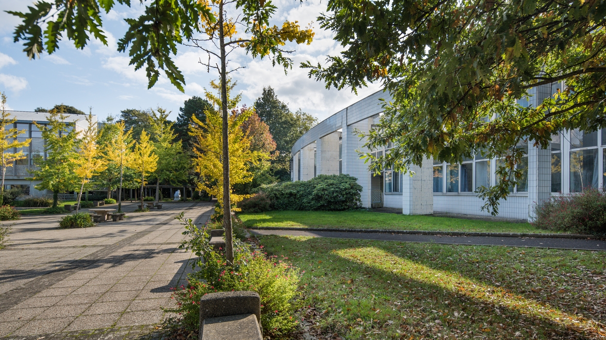Vue d'ensemble prise du nord : cour, pôle sciences et CDI.Immatriculation