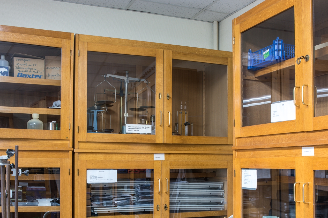 Armoire de rangement des collections pédagogiques, détail : balances de précision.Immatriculation