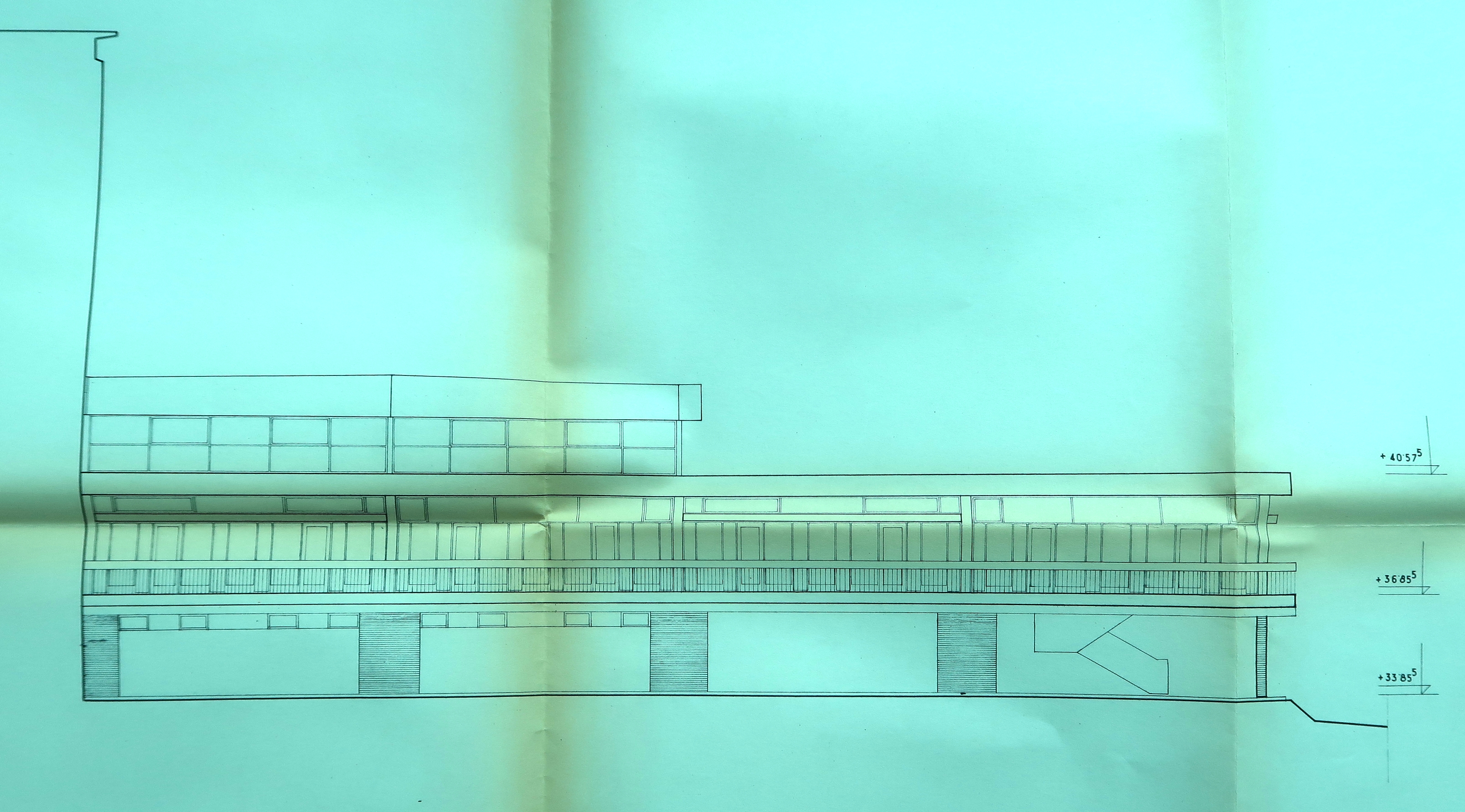 Restaurant, élévation de la façade ouest, J. Monge et R. Guichebaron, architectes, 1964.Immatriculation