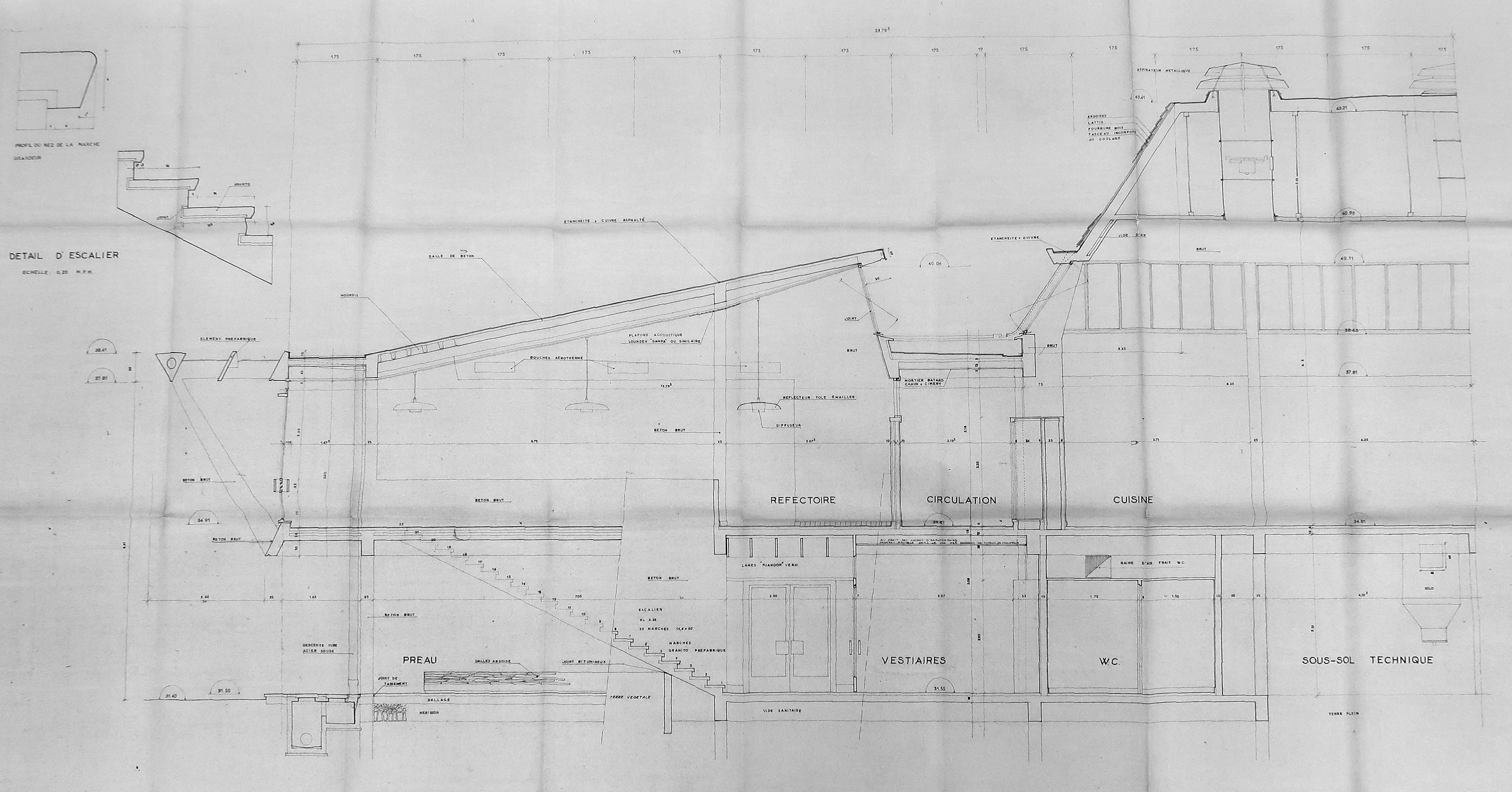 Réfectoire-cuisine, coupe-détail de la moitié ouest, selon un axe ouet-est, Louis Arretche, architecte, 1961.Immatriculation