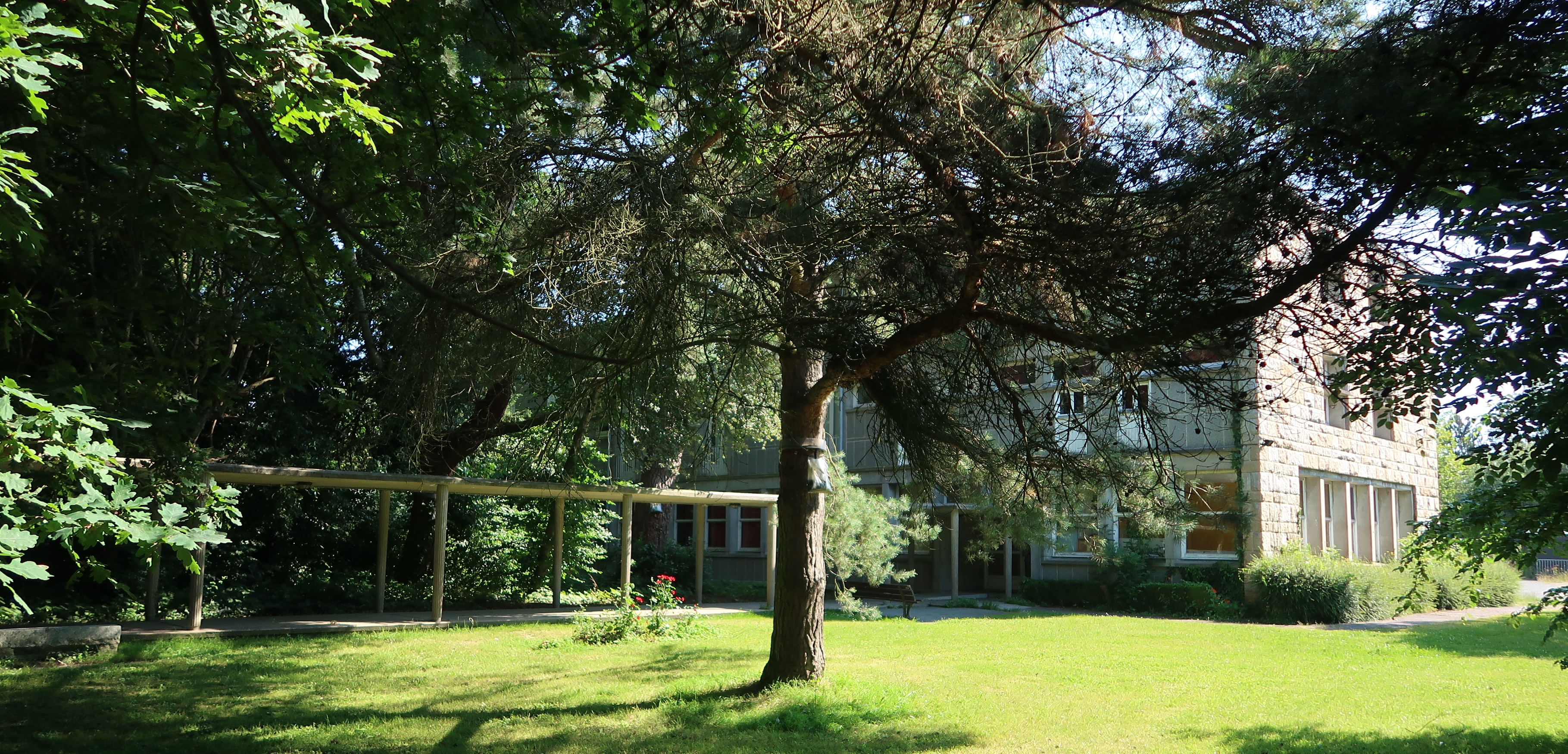 Bâtiment E (internat filles et externat), vue de l'angle sud-ouest, galerie de circulation et parc.Immatriculation