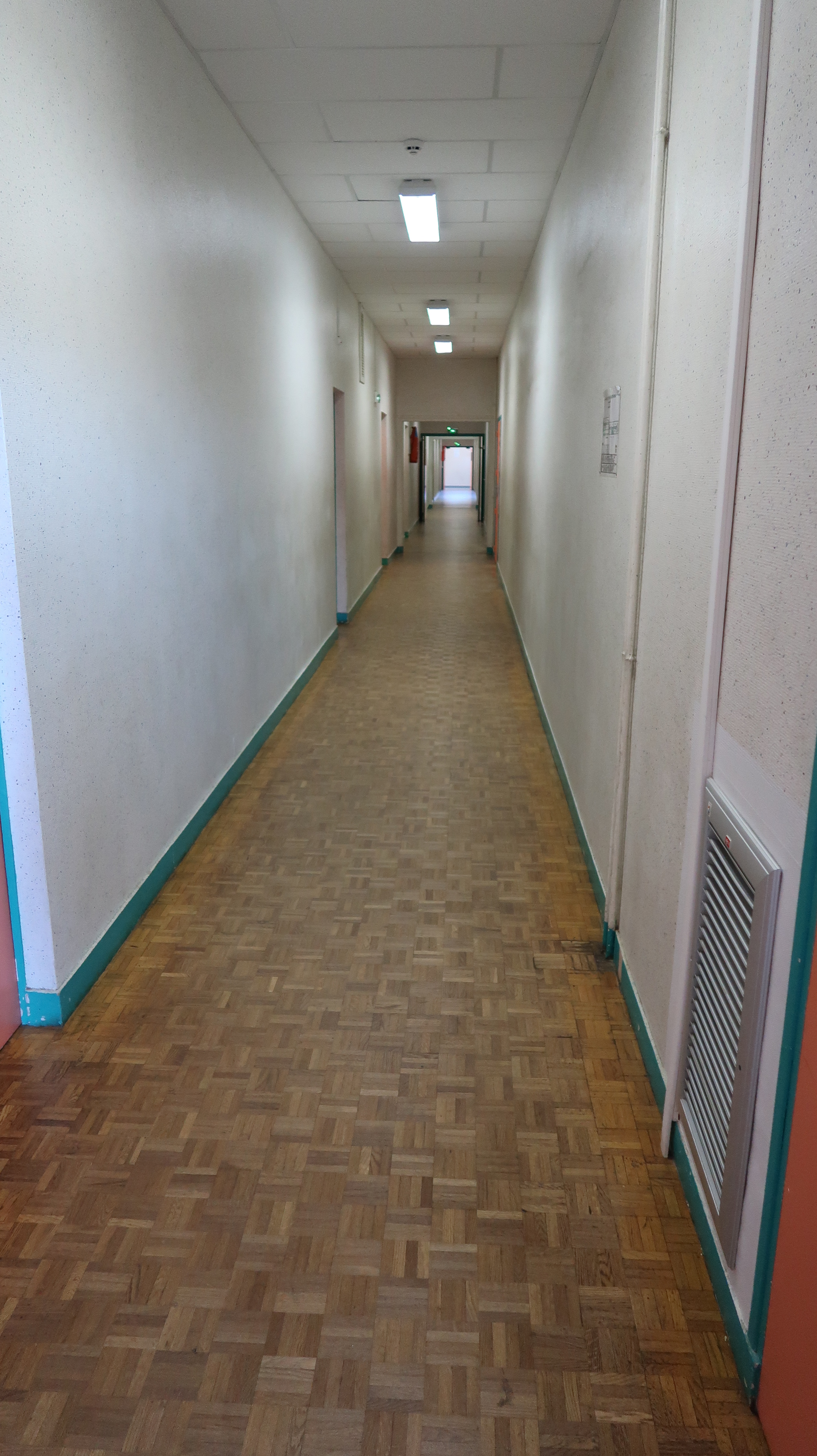 Un couloir d'internat parqueté. Les internats sont desservis par des couloirs centraux.Immatriculation