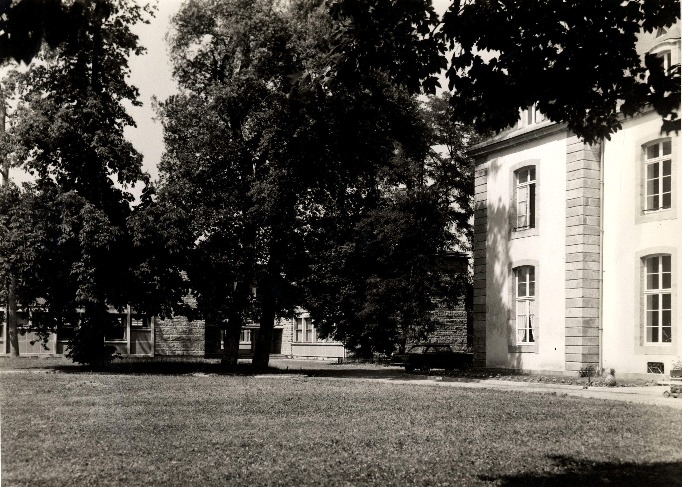 Vue partielle de la façade ouest de la "malouinière" de la Balue, actuellement administration et logement de direction, et de quelques uns des arbres du parc.Immatriculation