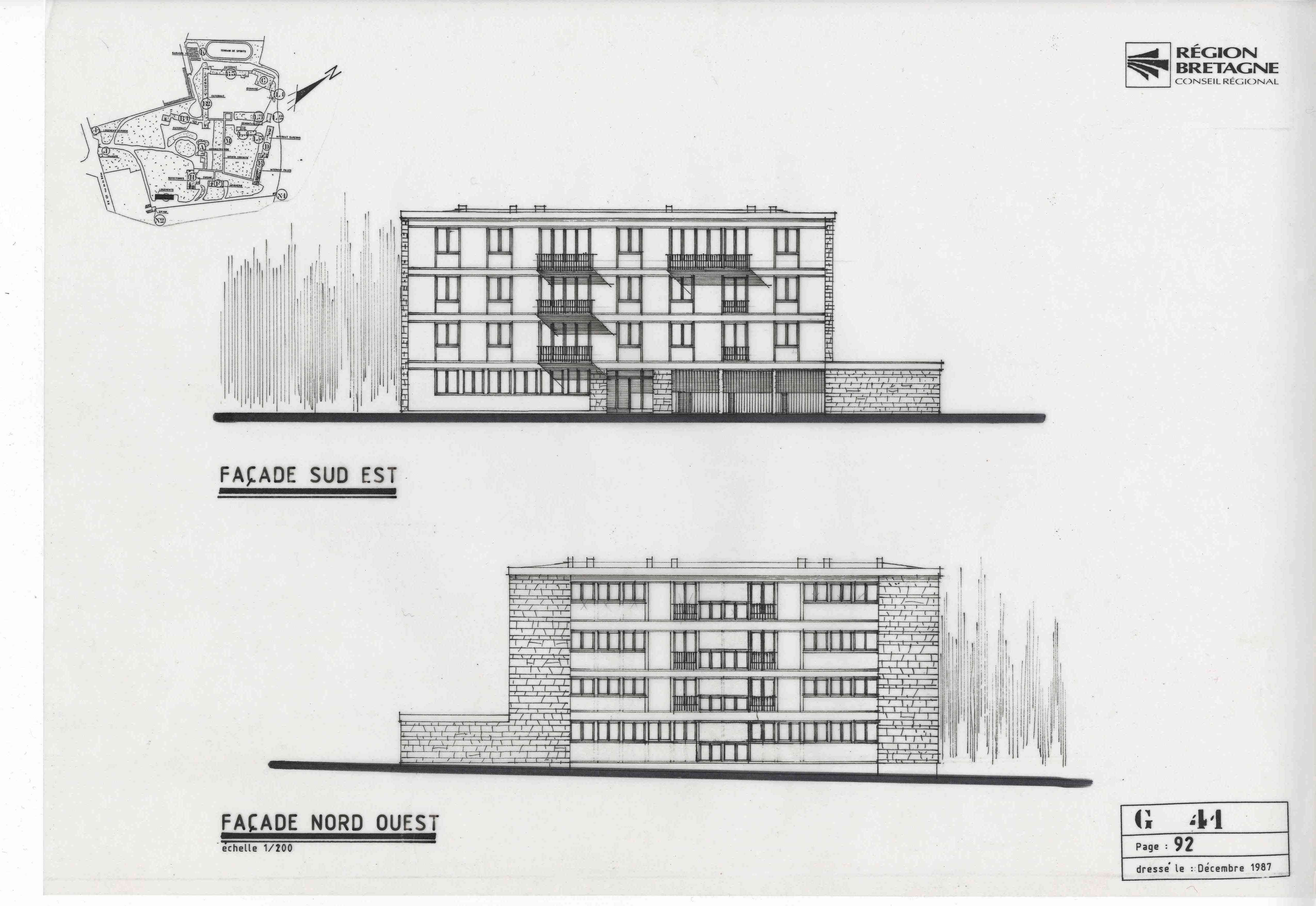 Archives de la direction de l'immobilier et de la logistique du Conseil régional de Bretagne : non coté. Lycée Jacques Cartier. État actuel. Jacques Salmon, décembre 1987.