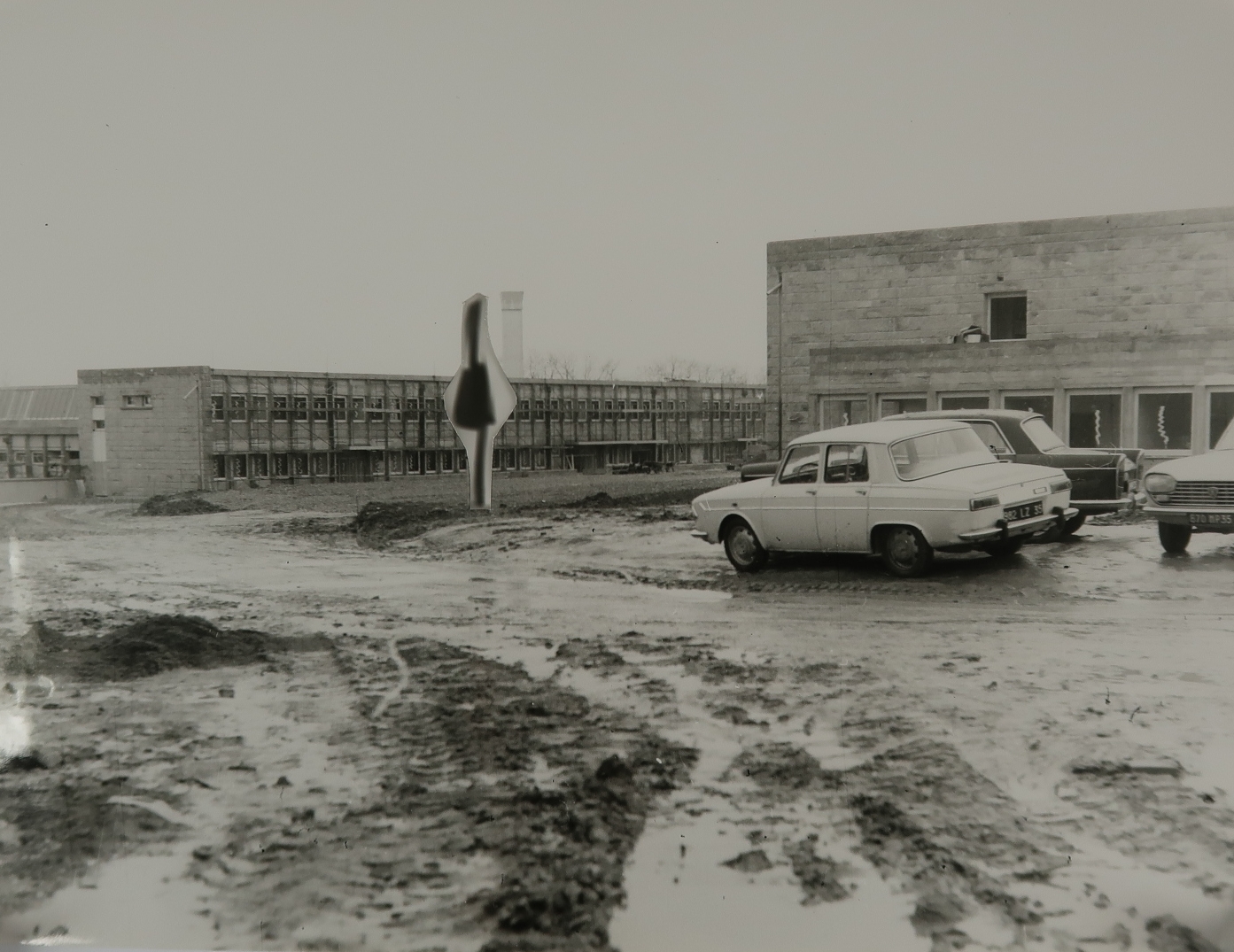 Francis Pellerin, maquette d'une sculpture (non réalisée), entre l'administration et les ateliers en chantier du lycée technique de Fougères, ca. 1968.Immatriculation