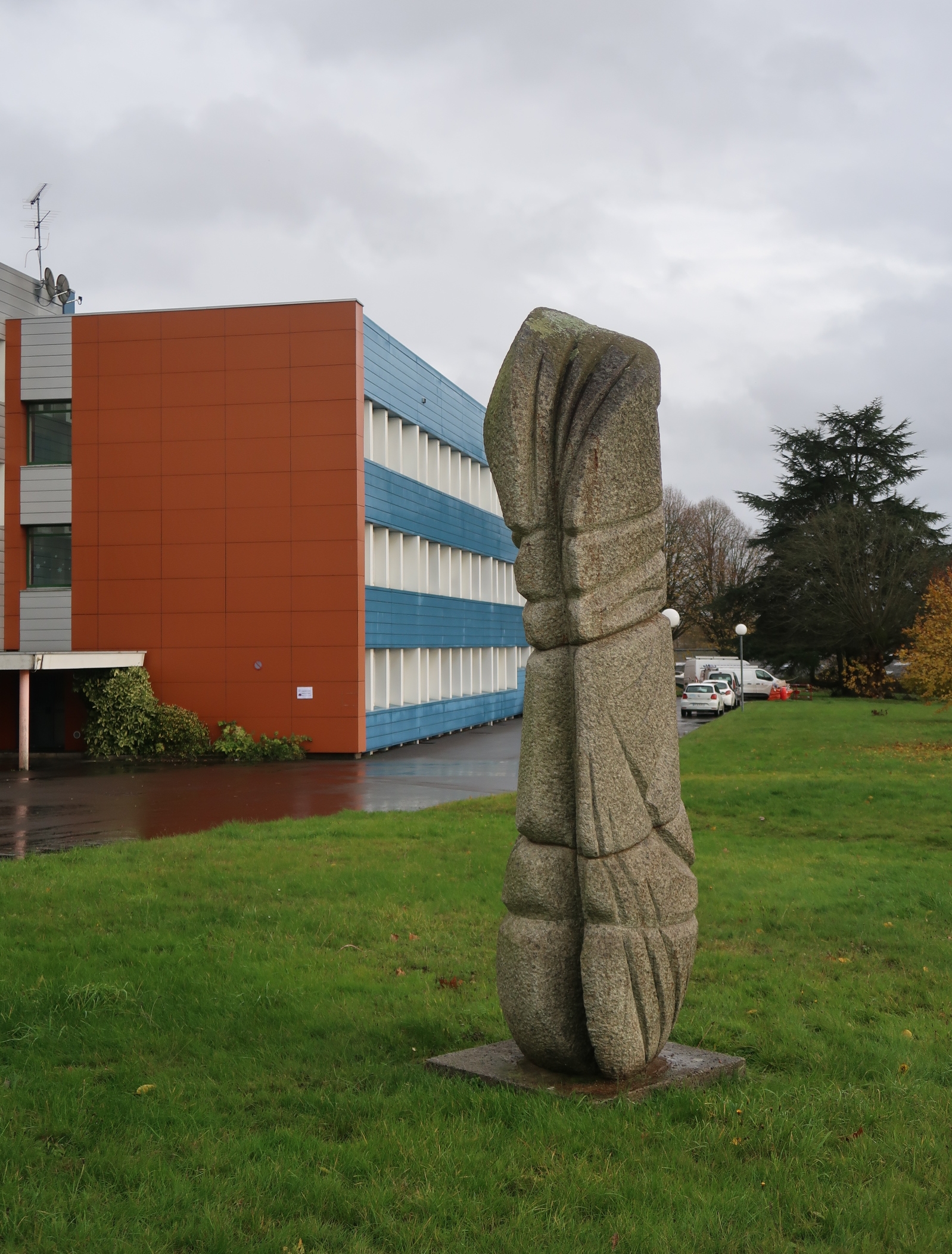 Sculpture en granite d'Hélier Pellerin et Lise Mazo, 1% artistique du lycée professionnel Jean Guéhenno de Fougères. A l'arrière plan, l'internat.Immatriculation
