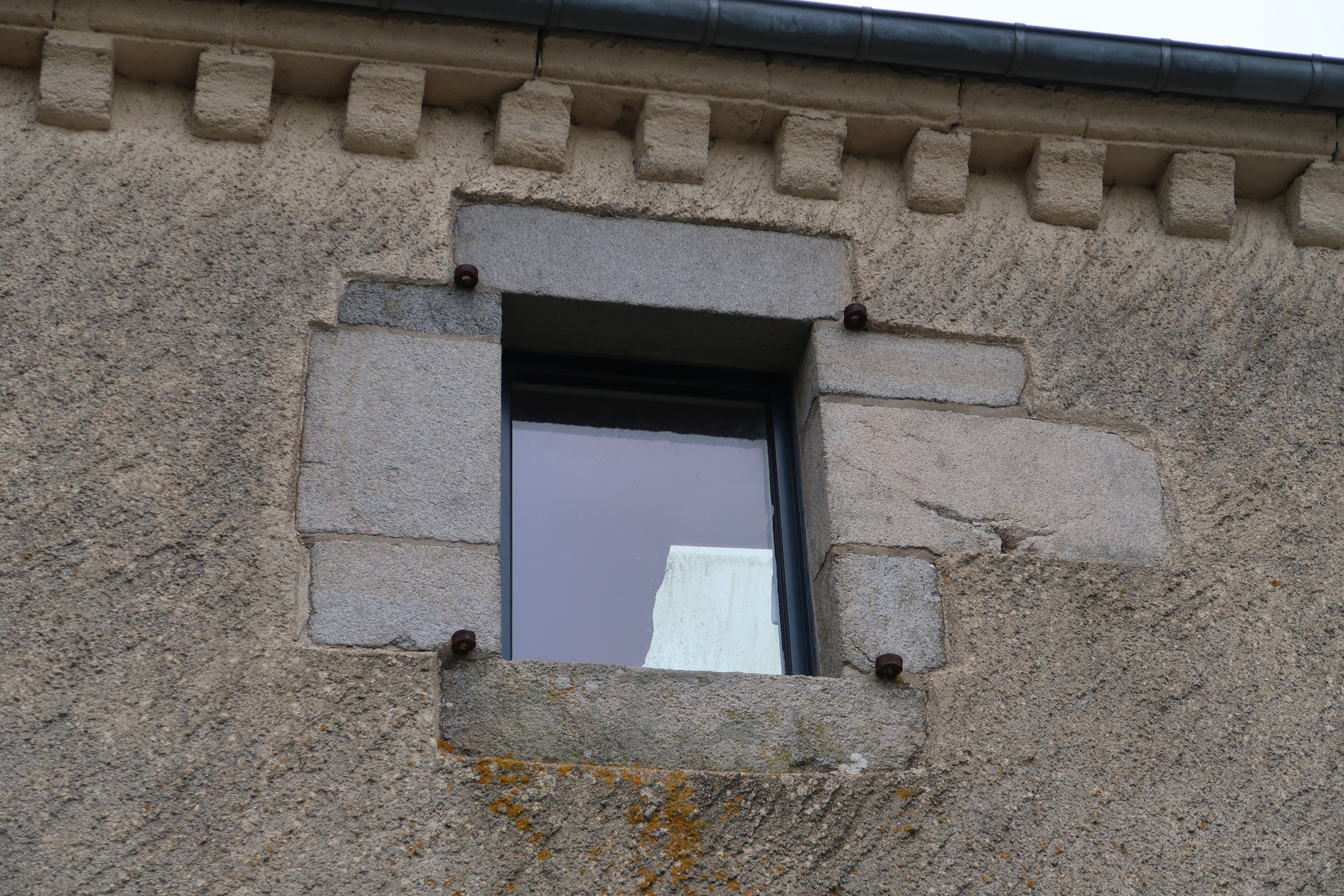 Fenêtre de l'étage et corniche à modillons scupltésImmatriculation