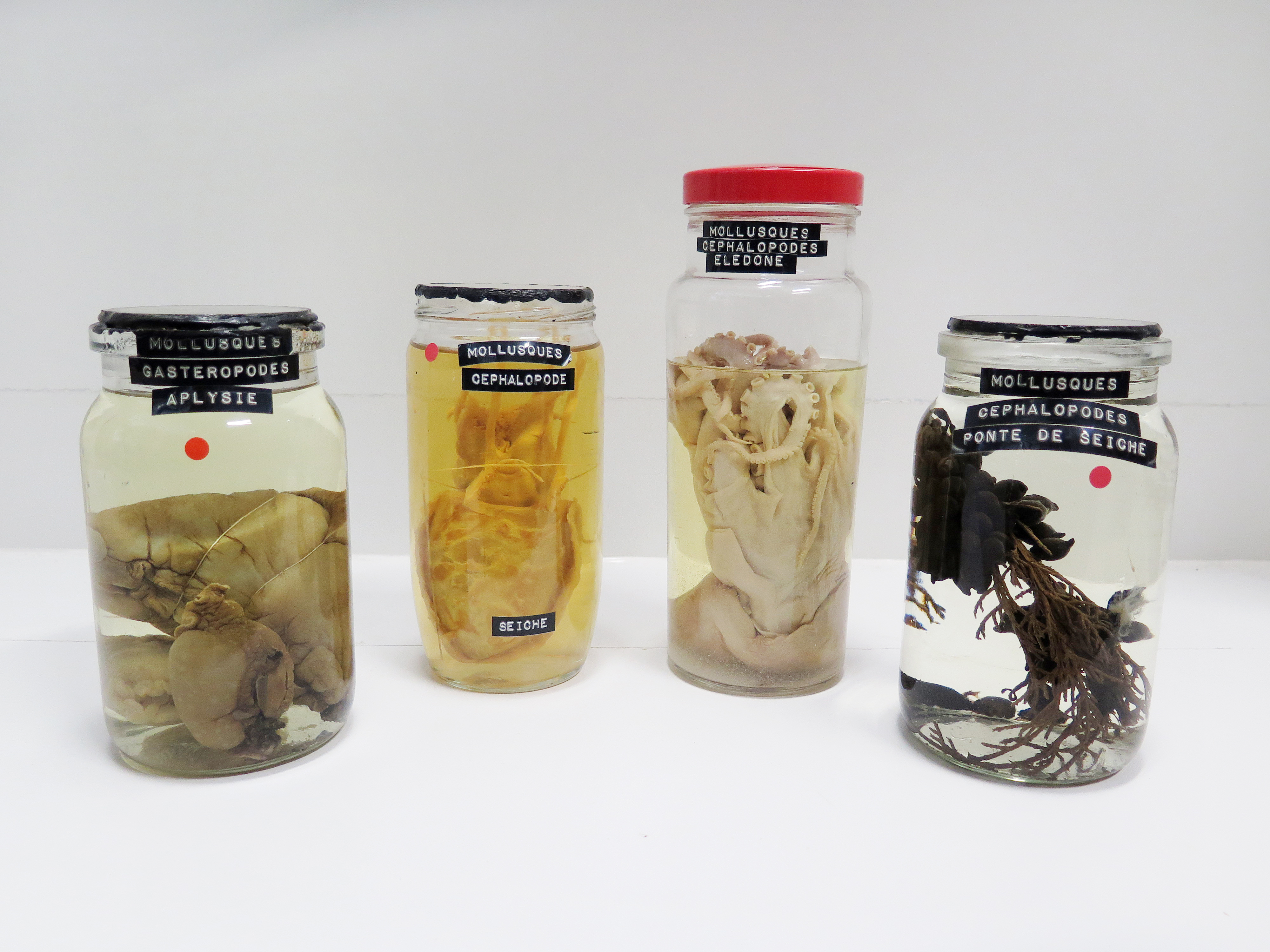 Ensemble de spécimens conservés dans des bocaux : aplysie (ou lièvre de mer), seiche, élédone (ou pieuvre musquée), oeufs de seiche - Zoologie – Embranchement des mollusquesImmatriculation