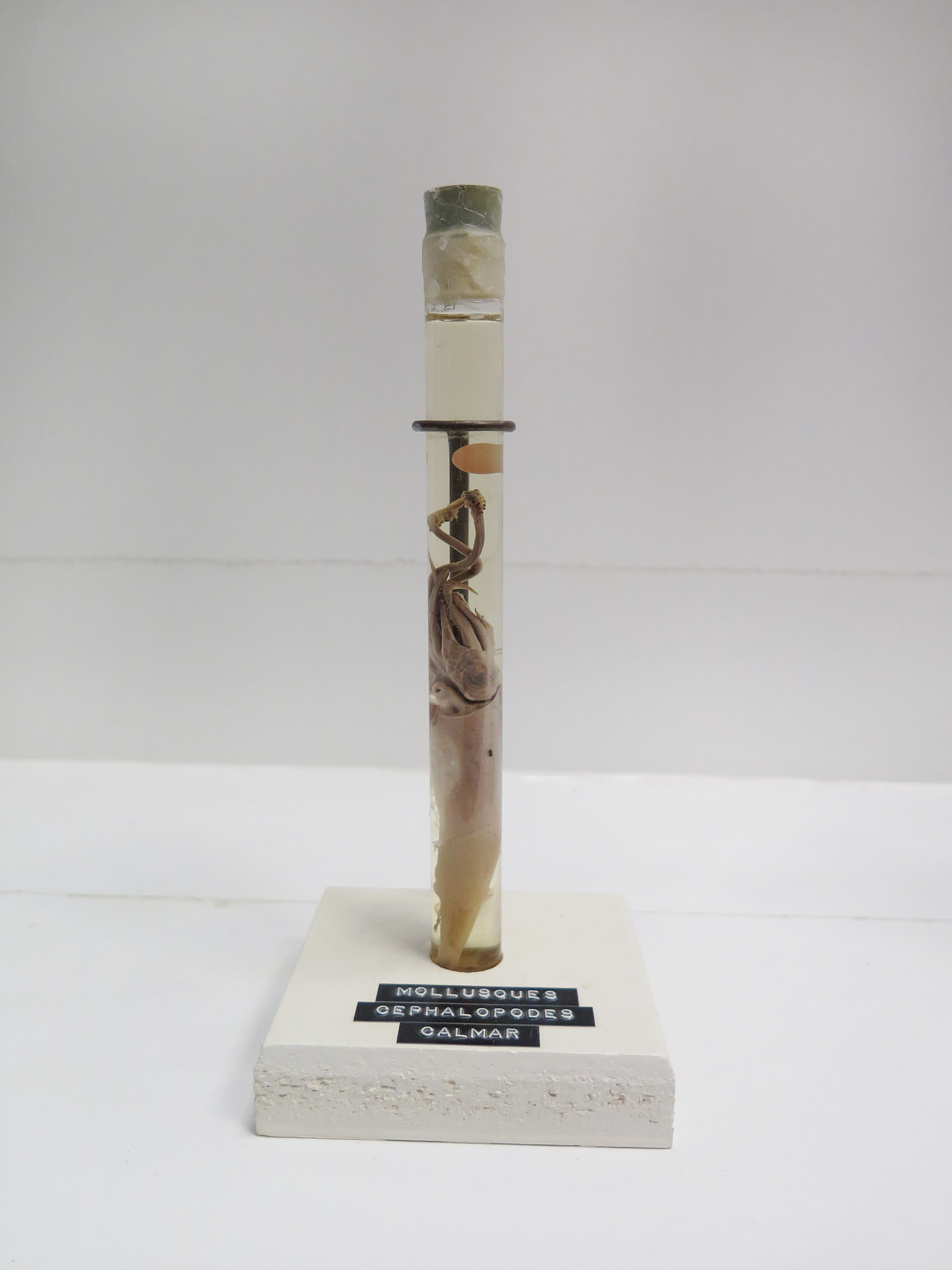 Fiole en verre contenant un petit calmar - Zoologie – Embranchement des mollusquesImmatriculation