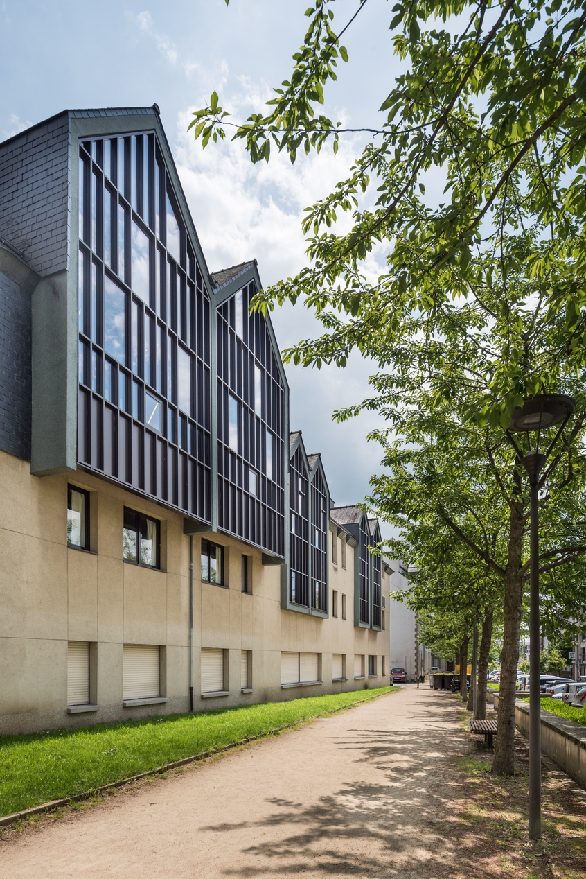 Façade sur rue du bâtiment N (réfectoire et salles de cours de sciences), Hervé L'Hyver, architecte, 1986-87. Vue prise du nord-est.Immatriculation