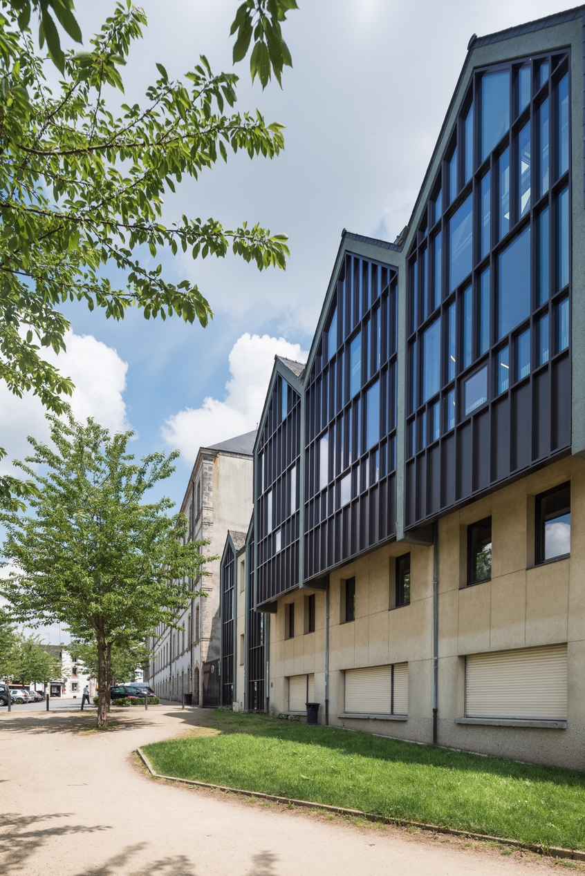 Façade sur rue du bâtiment N (réfectoire et salles de cours de sciences), Hervé L'Hyver, architecte, 1986-87. Vue prise du sud-ouest.Immatriculation