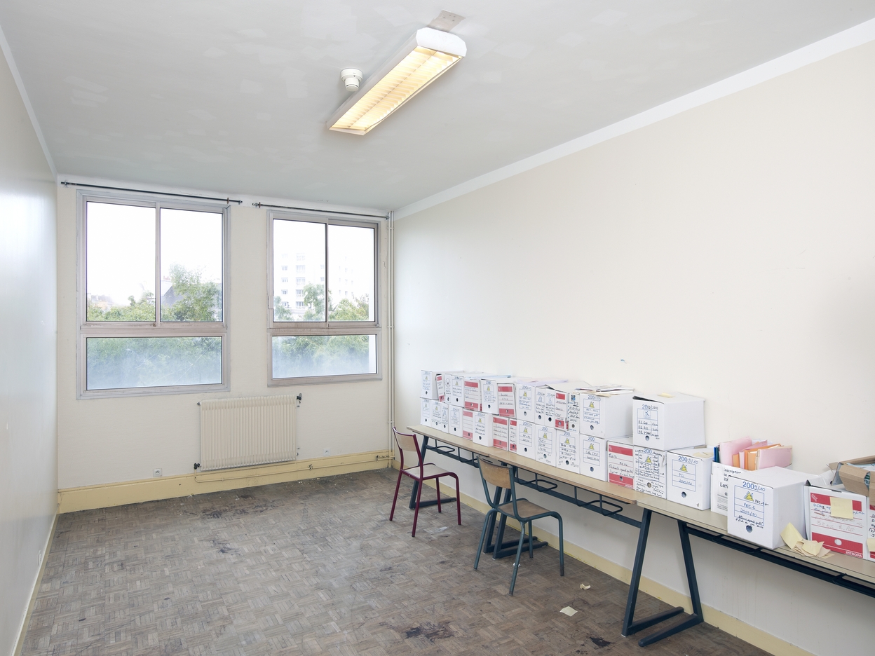 Chambre d'internes, internat de garçons (1954), désaffecté. Les cloisons ont été déplacées. A l'origine, les chambres étaient cloisonnées pour 6 lits, toutes les 3 trames de 1,75m (ici 2 trames).Immatriculation