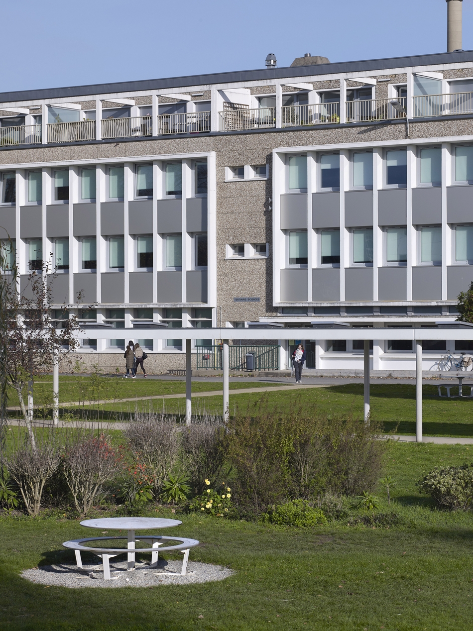 Bâtiment scientifique, façade sud-ouest (R. Ouvré et G. Tourry, architectes) : Détail centré sur la travée de l'escalier central. Noter l'isolation extérieure, le toit terrasse avec un étage de logements de fonction, en retrait de façade et le portique en béton.Immatriculation