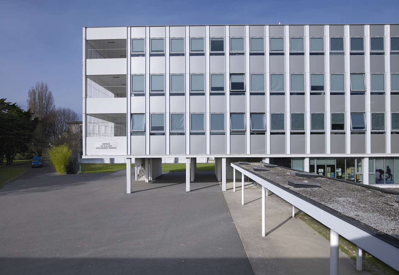 Nouvel externat P3 (S. Bertic et P. Debard, architectes, ca. 2005). Reprise contemporaine du vocabulaire architectural moderne présent dans le lycée : barre, façade tramée, toit terrasse, et ici, pilotis...Immatriculation