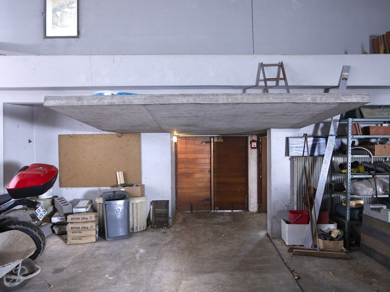 Chapelle, vue intérieure. René Ouvré architecte (1966-1967). La marquise en béton au dessus de l'entrée.Immatriculation