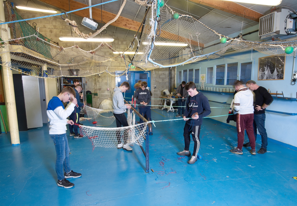 Atelier ramendage, décoré de filets suspendus.Immatriculation