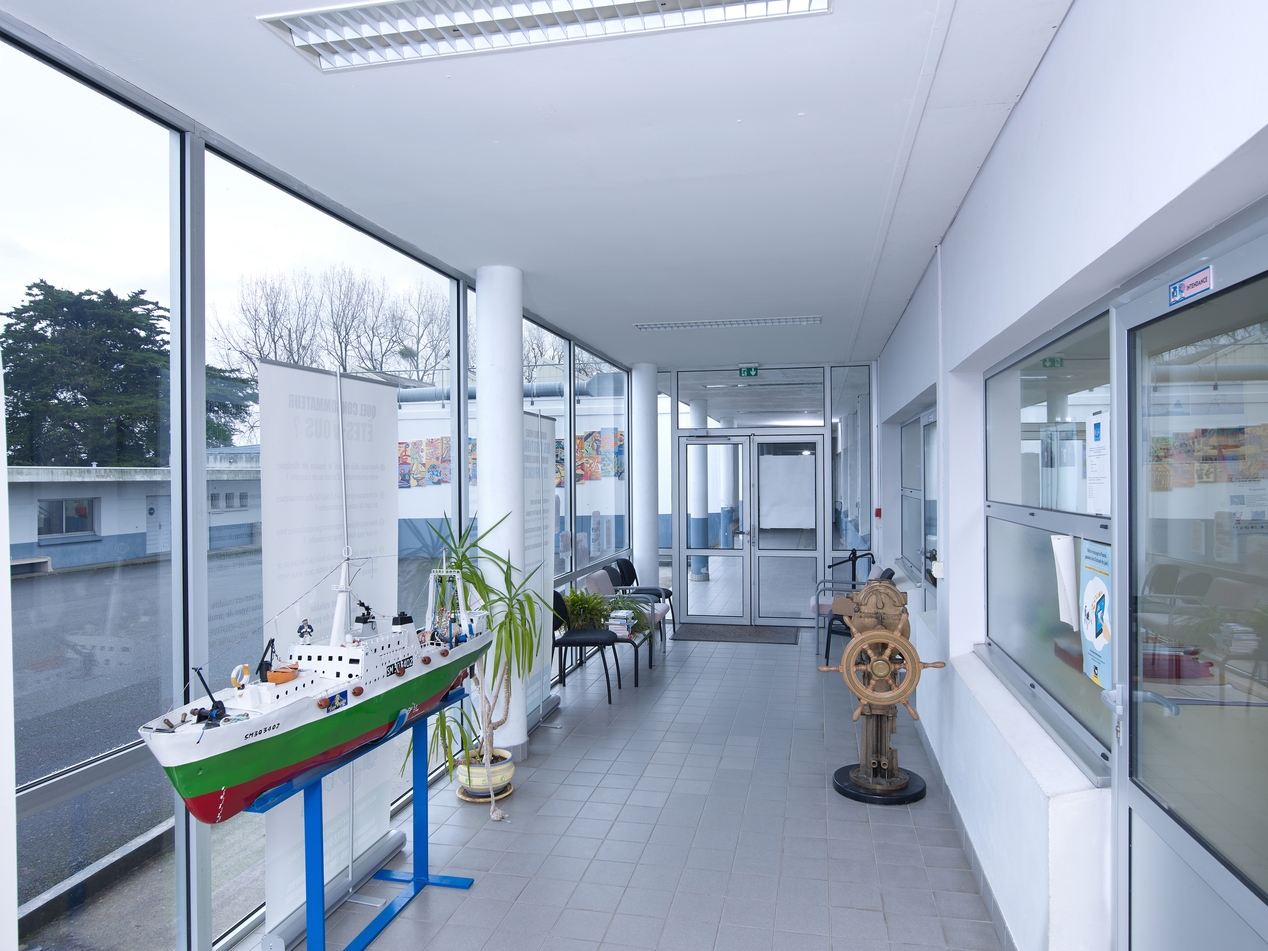 Ancienne galerie ouverte, transformée en couloir vitré (Pascal Debard, architecte). Maquette du Victor Pleven, chalutier industriel (pêche à la morue)Immatriculation