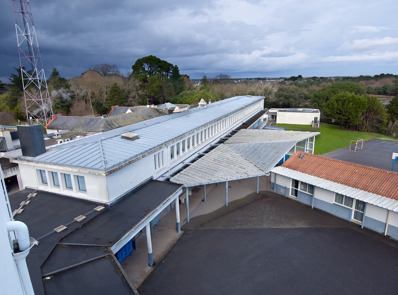 Vue d'ensemble de la cour prise de la tour (depuis le sud) : à gauche, l'internat (J. Deyrolle, architecte, 1952). A droite : extensions de 1985 et 1987 : "foyer-bar-cinéma" et CDI, façade sud, prise de l'étage de l'internat (M. Ysvelain et Cl. Blin, architectes.), à l'arrière plan, salle Île-de-Groix et logement de fonction.Immatriculation