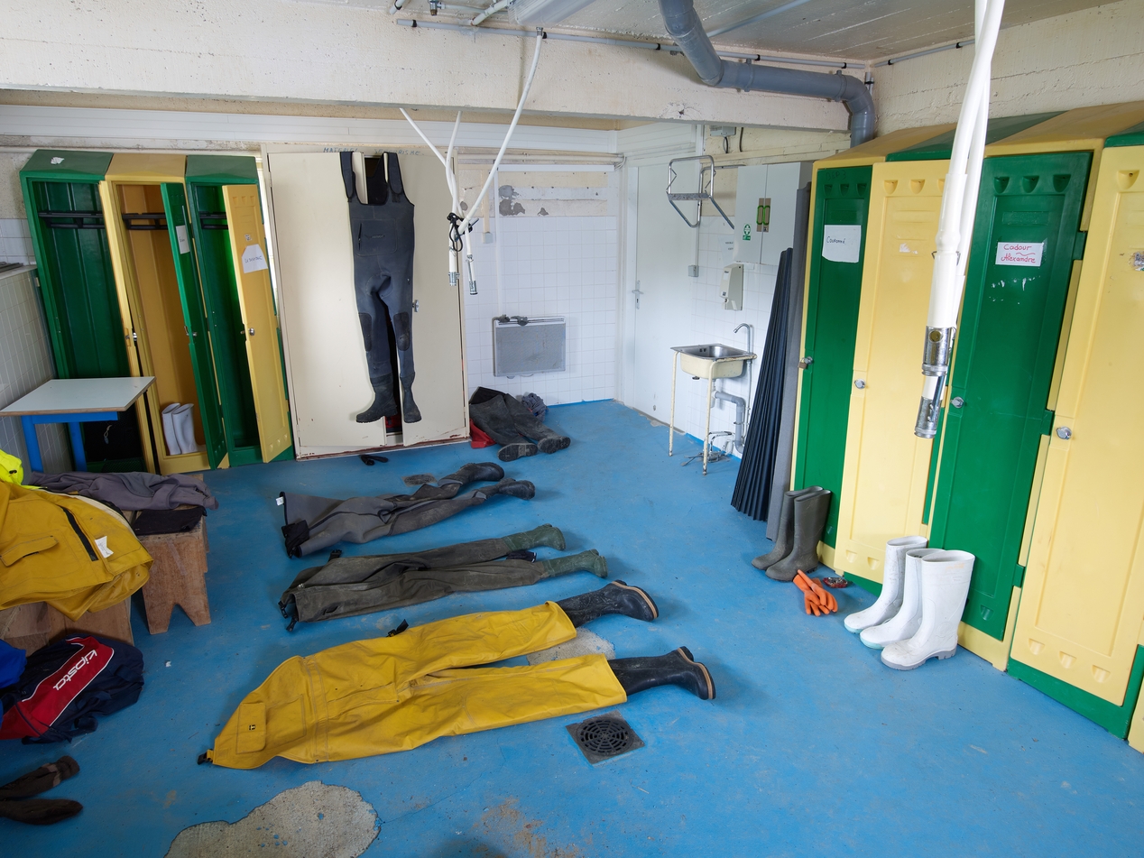 Vestiaire : séchage des cuissardes de pêche ("waders)".Immatriculation