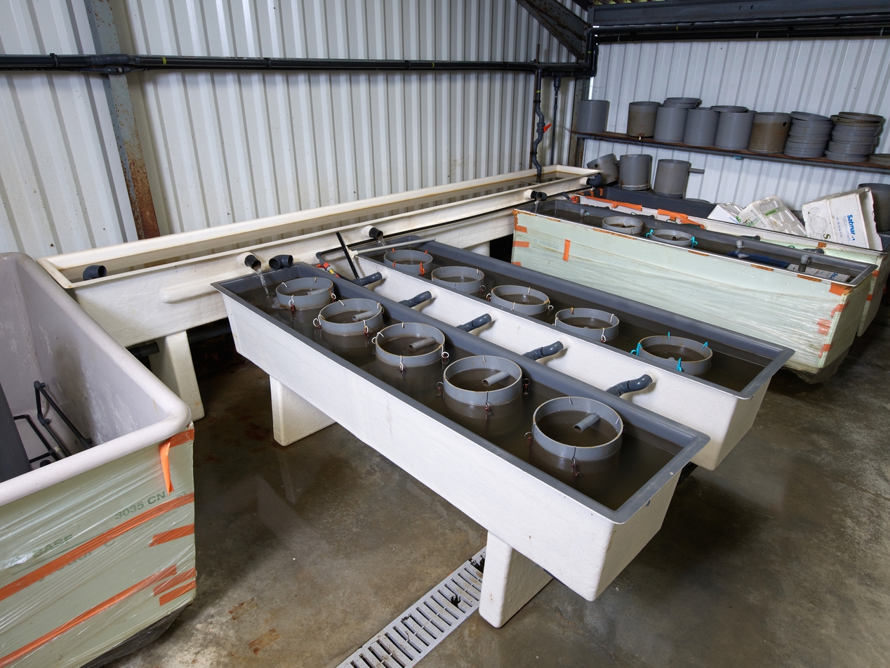 Ferme aquacole : vue d'un atelier.Immatriculation