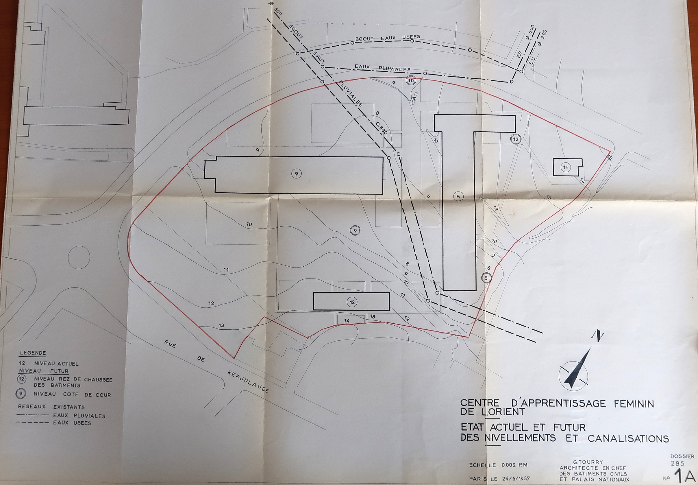 Archives du lycée Marie-Le-Franc, Tourry [G.], Centre d'apprentissage féminin de Lorient. Etat actuel et futur des nivellements et canalisations, 24/6/1957.