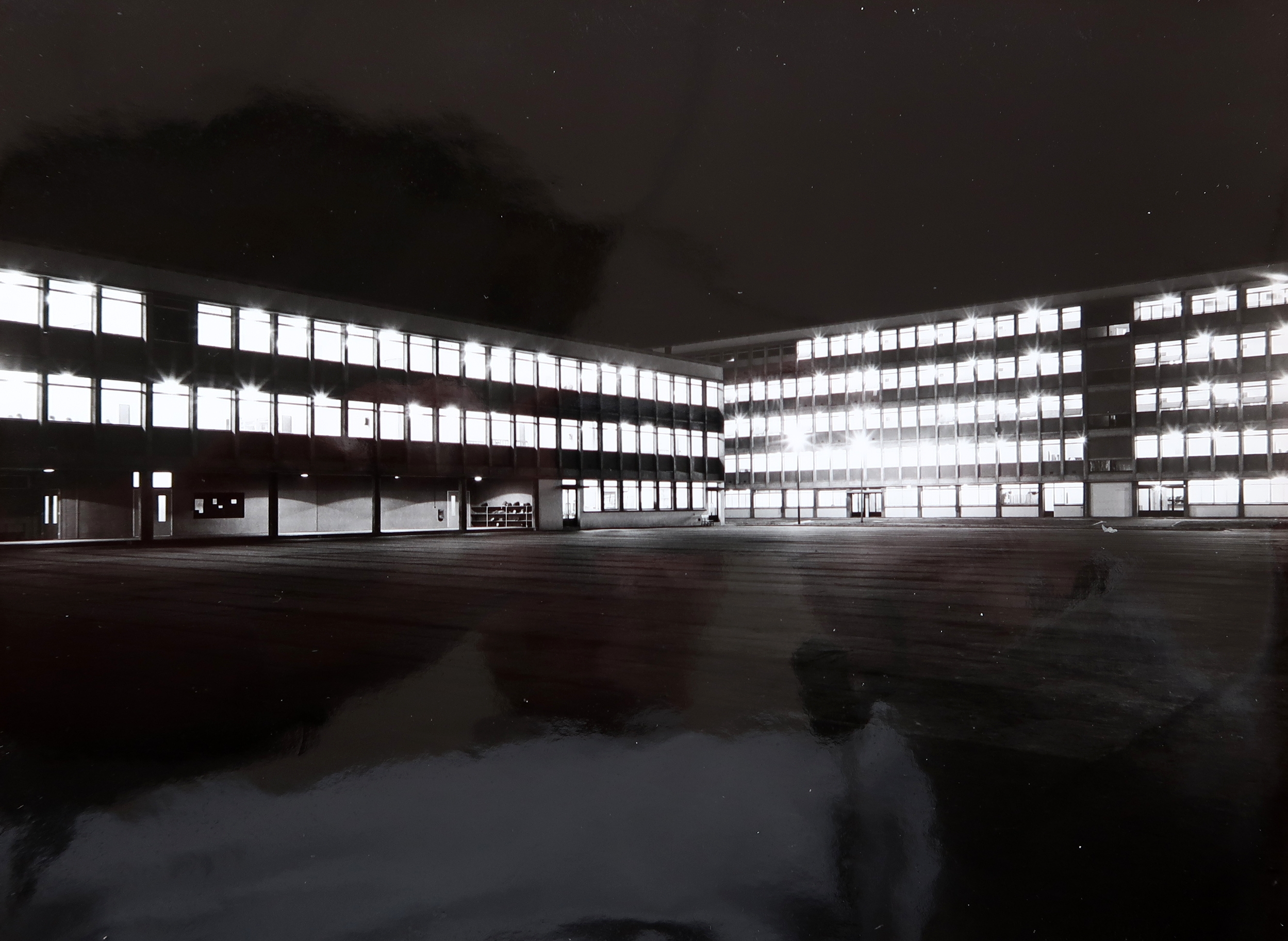 Bâtiments C et B pris de la cour, toutes salles éclairées.Immatriculation