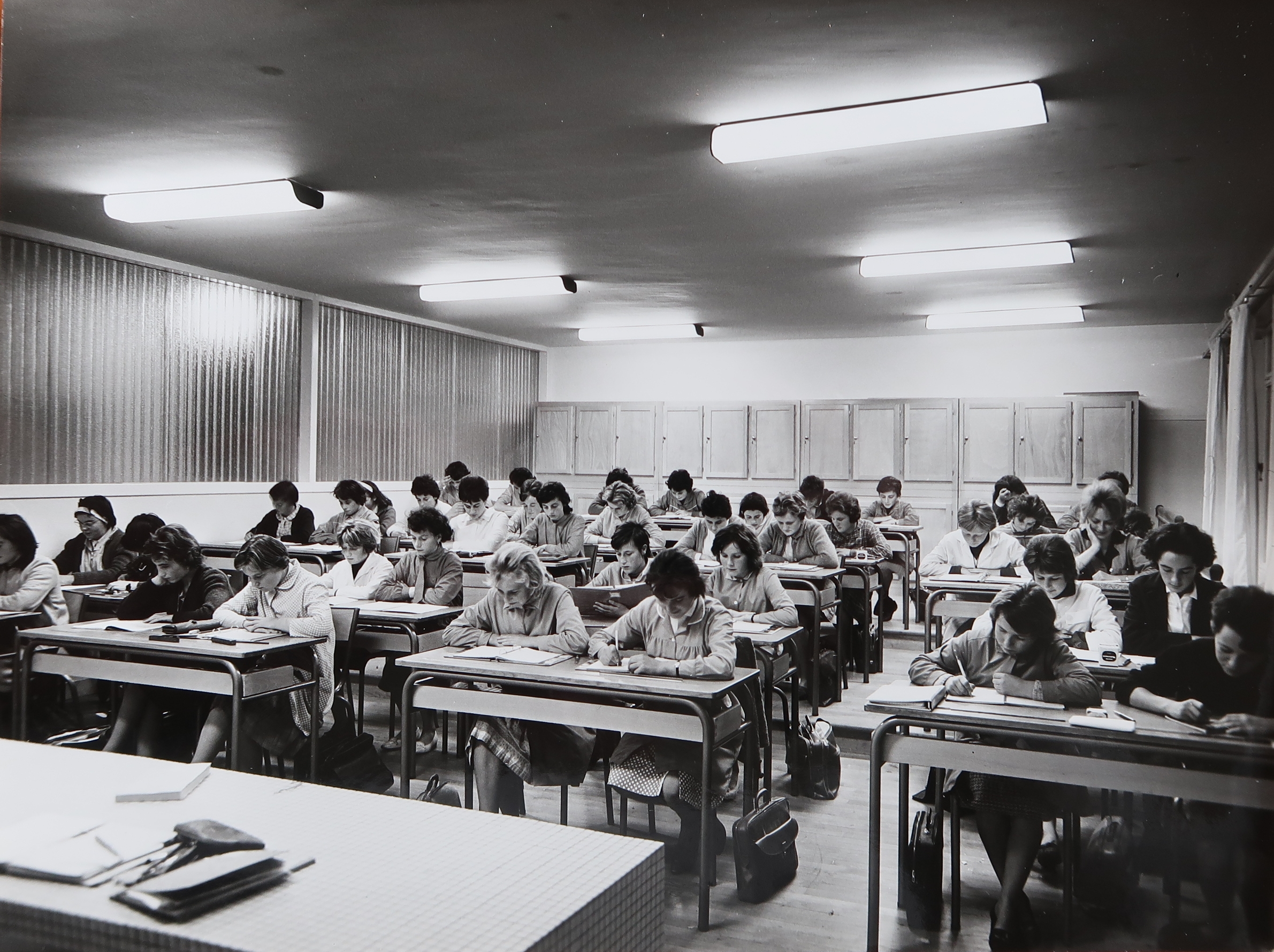 Salle de classe dans les années 1960 : paillasse du professeur, tables par deux, casiers.Immatriculation