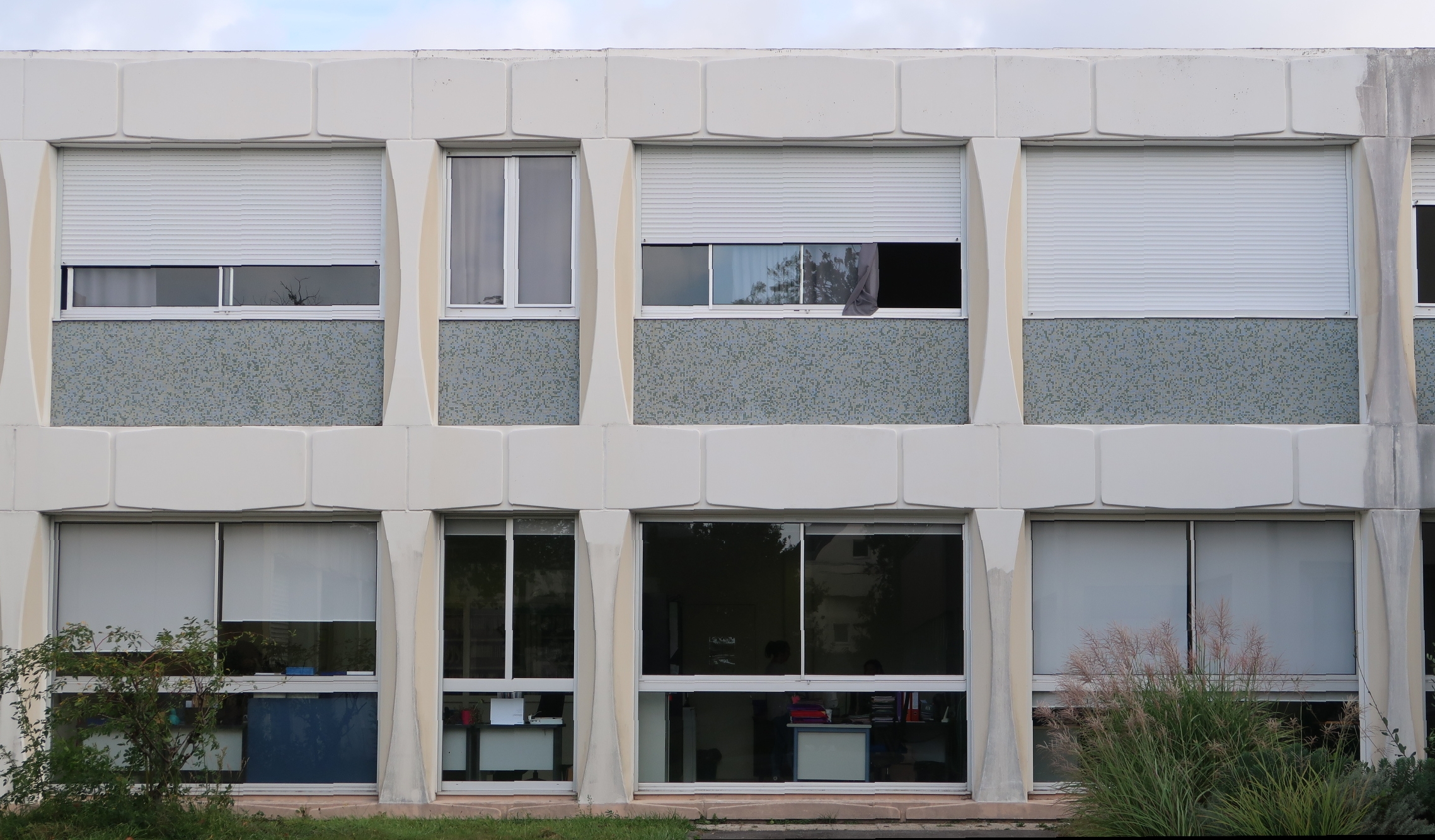 Détail de la modénature de la façade sud de l'externat (bâtiment A), noter l'alternance de travées larges et étroites, le moulage des poteaux en béton armé, les formes courbes soulignées de jaune-paille, les panneaux de grès bleu-nuit, gris-bleu.Immatriculation
