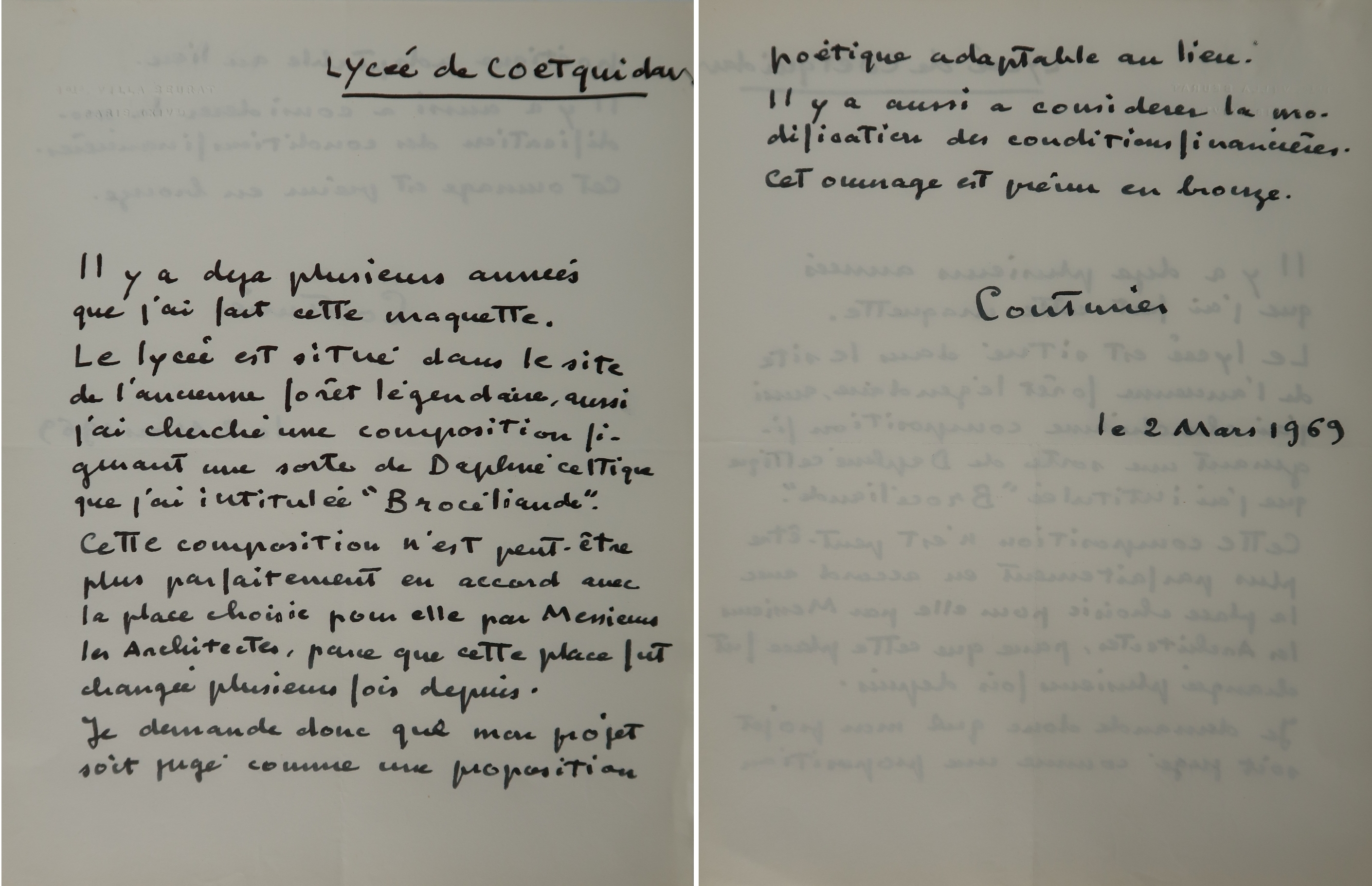 Courrier de Roger couturier à propos de sa sculpture "Brocéliande" au lycée de Guer (2 mars 1969).Immatriculation