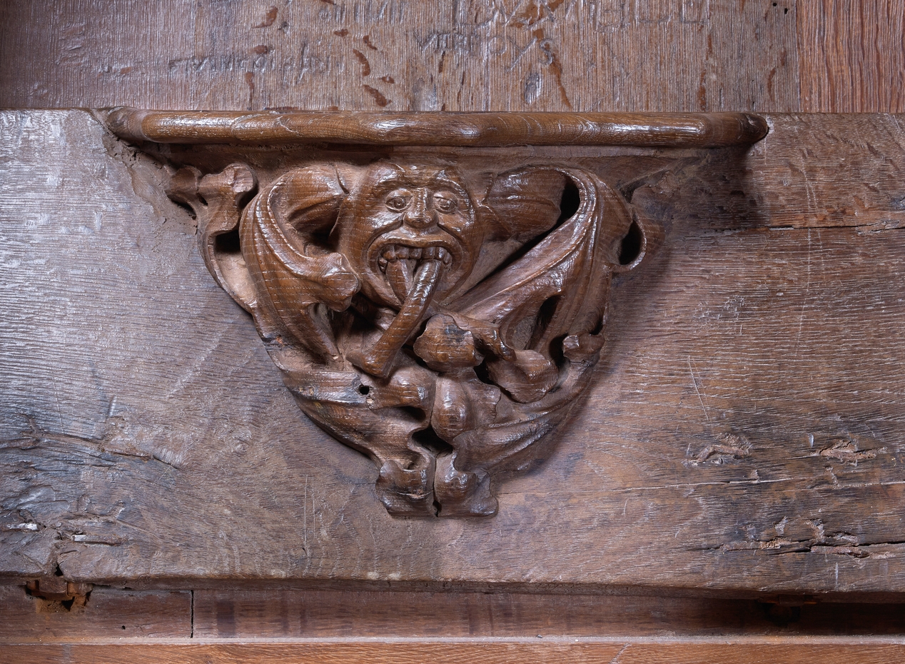 Détail de l'une des stalles : un montre marin (?)Immatriculation