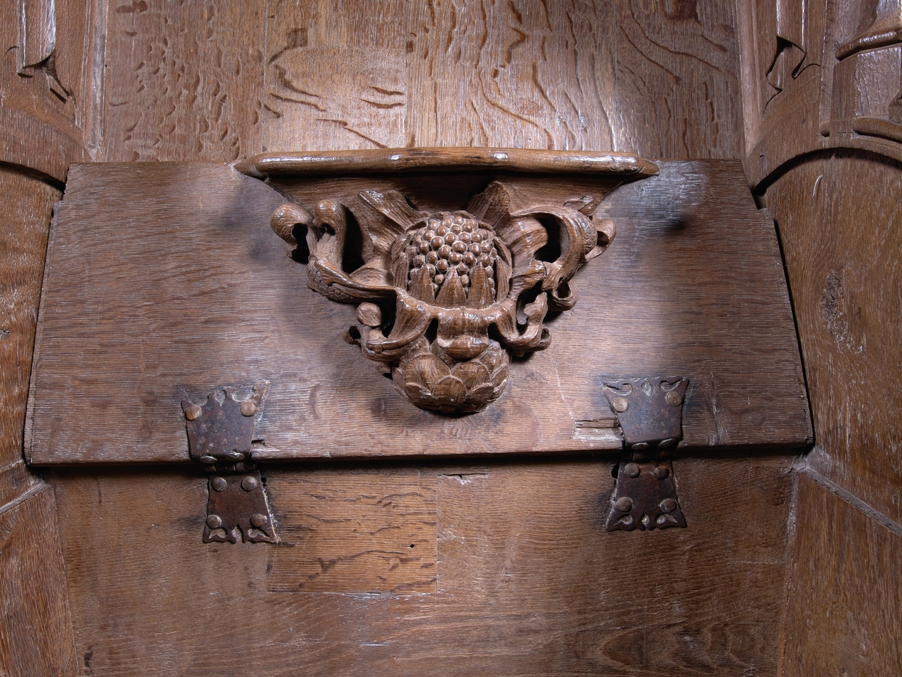 Détail de l'une des stalles : ornement végétalImmatriculation