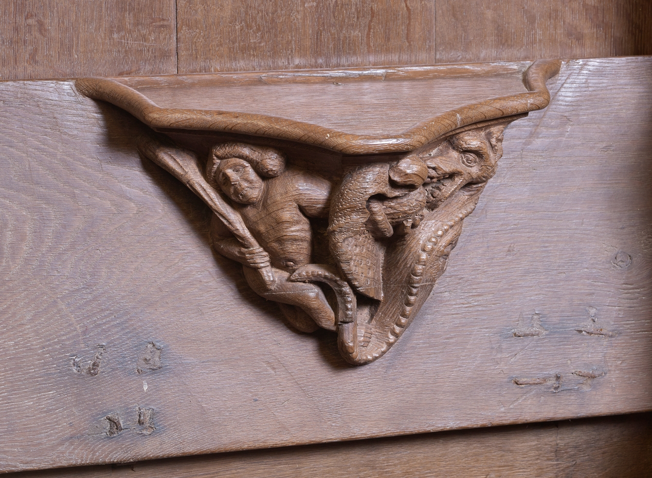 Détail des stalles : combat entre un homme sauvage armé d'un baton et un dragonImmatriculation