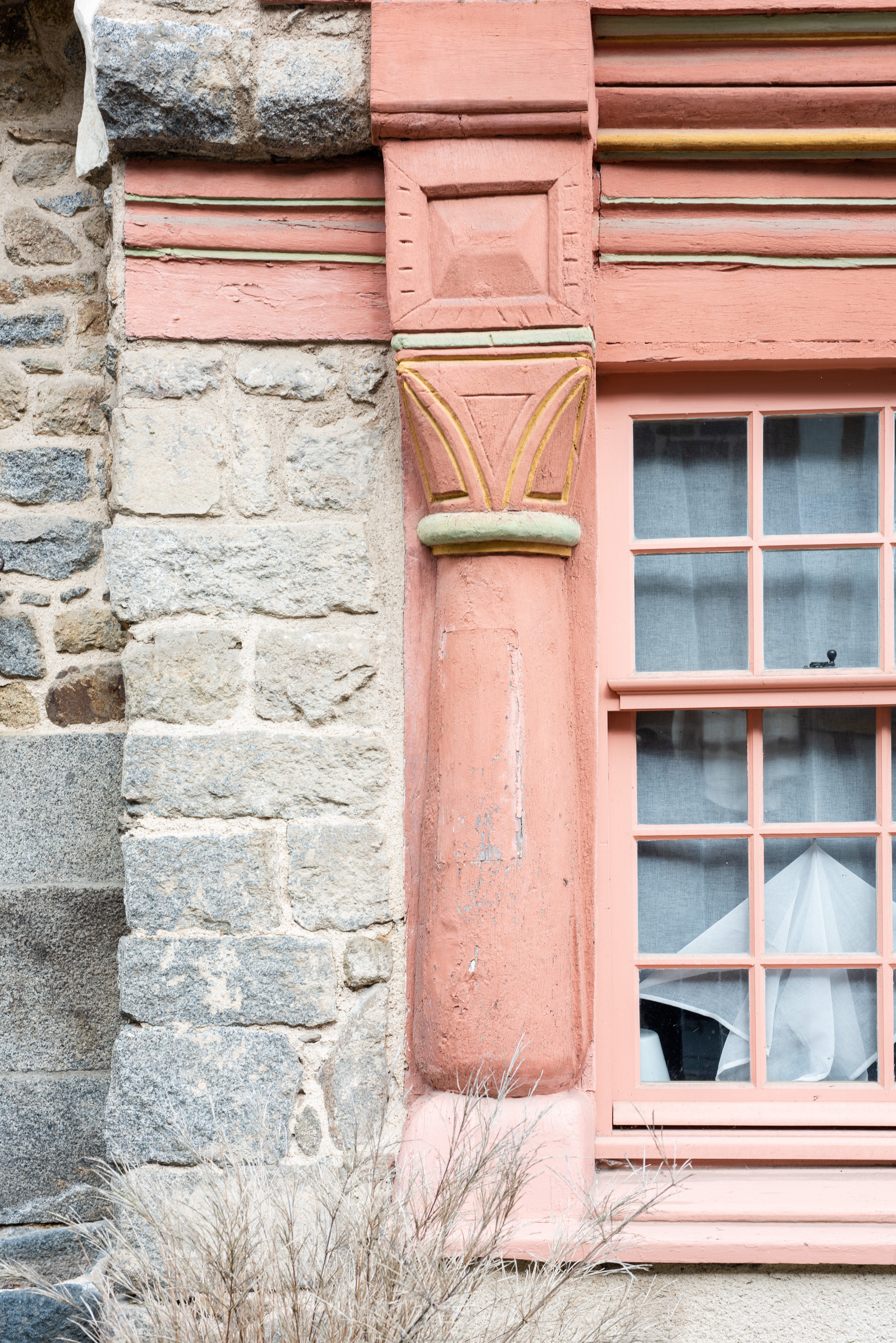 Façade en pan de bois à colonnes et pignon maçonnéImmatriculation