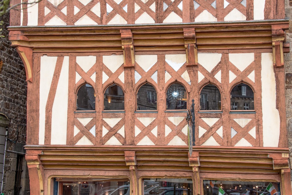 Premier étage éclairé par des fenêtres dont le linteau forme une accolade et contreventé par une écharpe coudée.Immatriculation