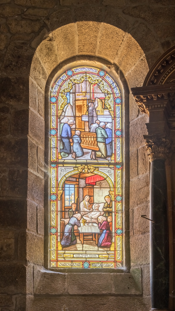 Ensemble de 8 verrières à personnages des baies 1 à 8 : Miracles de Notre-Dame du Guiaudet,