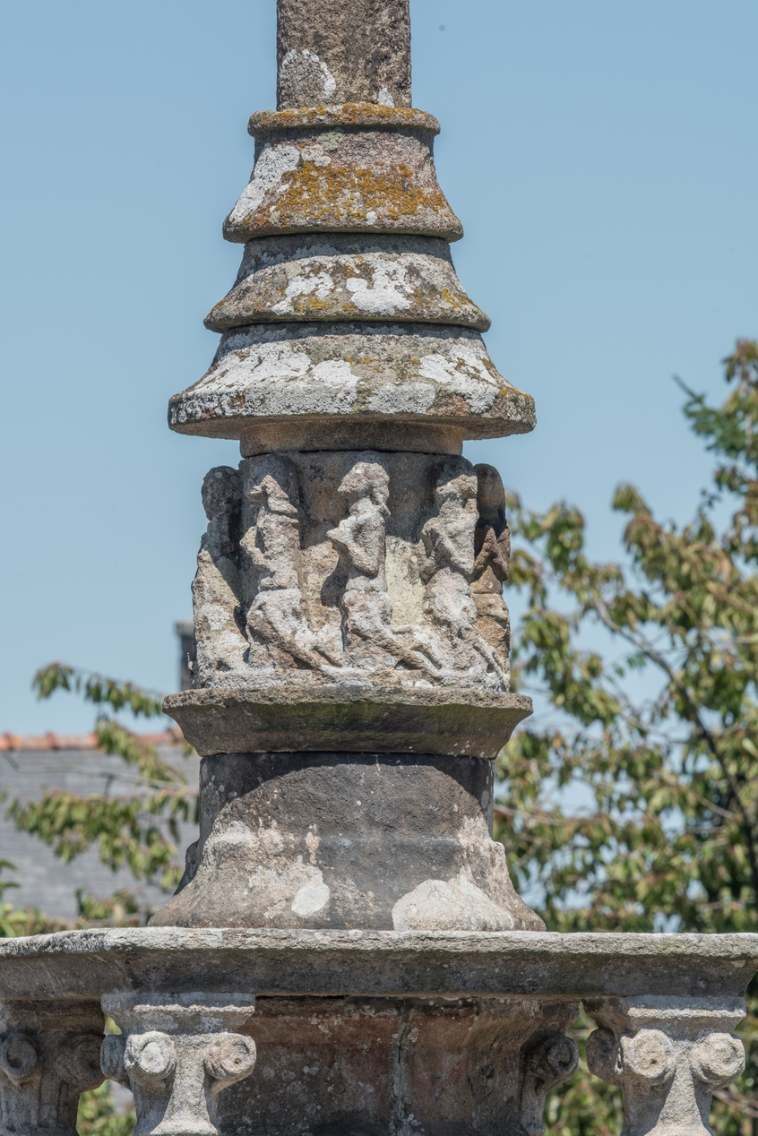 Vue de détail de la base du fût : chapiteaux des colonnettes porteuses de la table et tambour orné de neuf personnagesImmatriculation