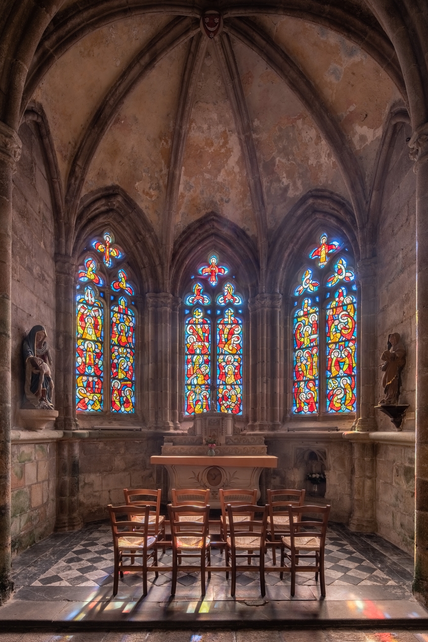 Chapelle Sainte-Croix, vitraux de Hubert de Sainte-Marie maître-verrier de Quintin datés 1972Immatriculation