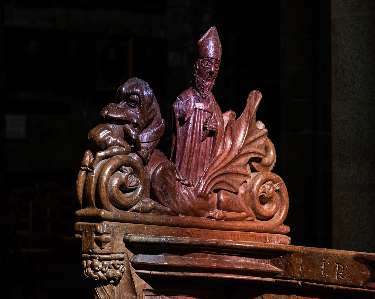 Rangs nord, détail de l'intérieur de la jouée ouest des stalles basses, représentation de saint Tugdual terrassant le dragonImmatriculation
