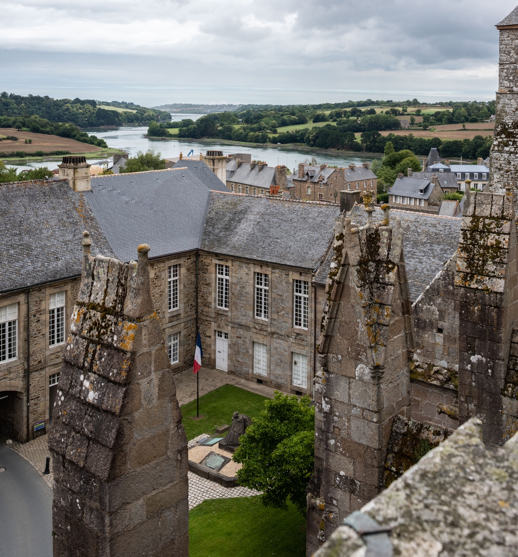 Corps principal du palais et de l'aile sud, détail de l'élévation sud depuis la cathédrale Saint-Tugdual. En arrière-plan, la rivière de TréguierImmatriculation