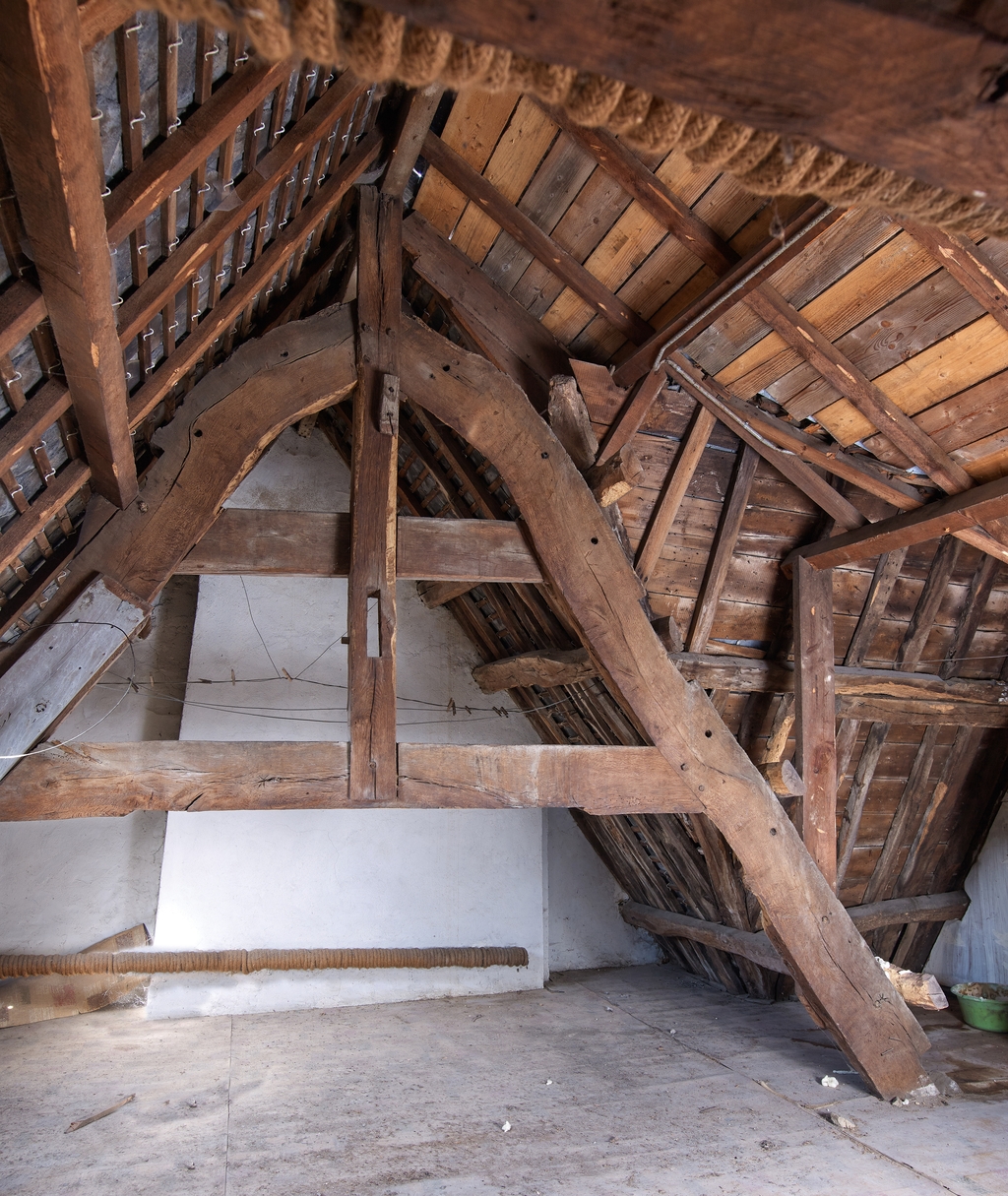 9 rue Colvestre : maison, étage de comble, détail d'une ferme de charpente (état en 2020)Immatriculation