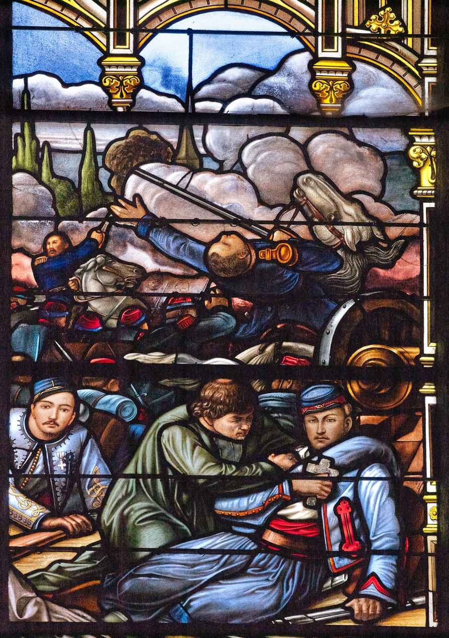 Détail de la verrière du voeu de la guerre : un soldat reçoit les derniers sacrements lors de la bataille d'Auvours (11 et 12 janvier 1871)Immatriculation