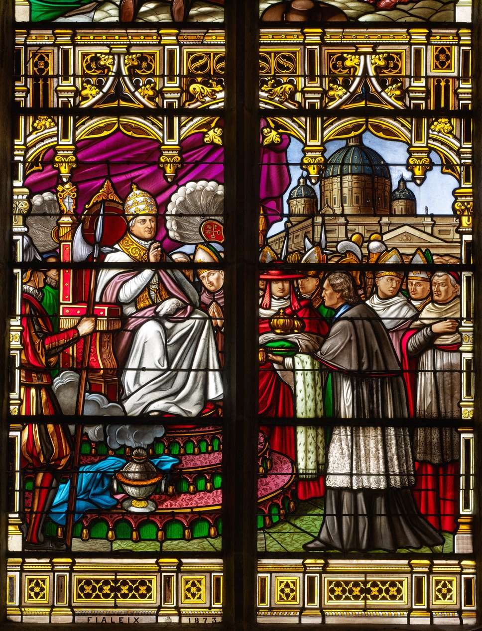 Détail de la verrière du couronnement de la Vierge en 1857 : le pape Pie IX à Rome remet les couronnes des statues de la Vierge et de l’Enfant Jésus à un ecclésiastique bretonImmatriculation