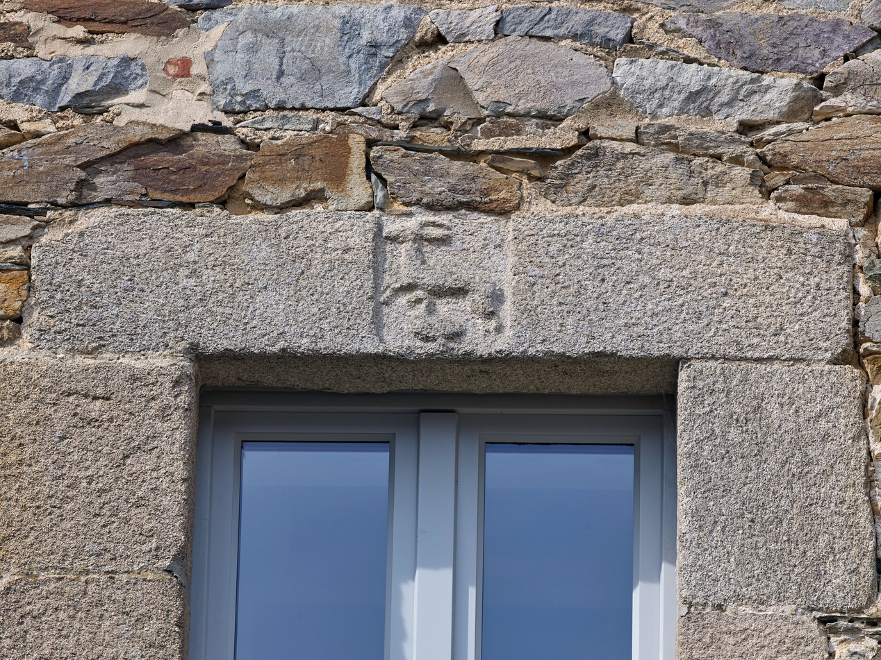 Tréguier, 9 rue des Perdreries (Perderies) : maison dite "Scolasticat", aile nord en retour d’équerre vers l’est, élévation sud sur cour, détail d'une fenêtre armoriée du premier étage, état en 2020Immatriculation