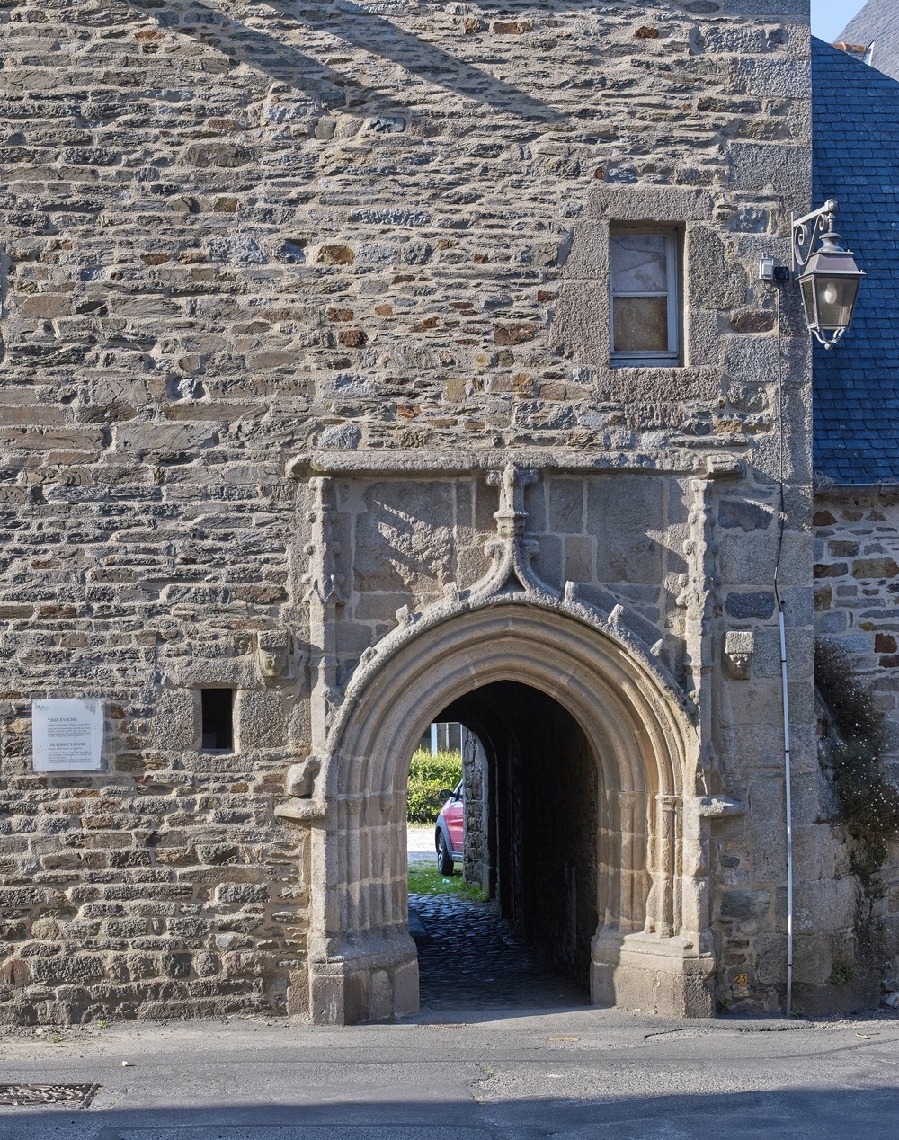 Corps de logis. Elévation sud sur rue. Détail du portail gothique avec les armoires martelées au-dessus de la porte, protégées par un larmierImmatriculation