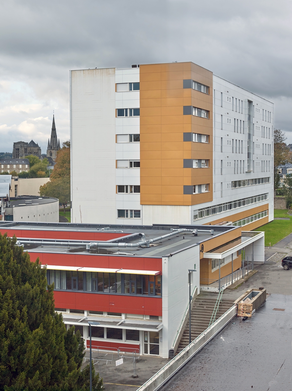 Bâtiment B (internat, logements, classes) et, au premier plan, bâtiment C (restauration, infirmerie, foyer), angles sud-est. André Remondet et Patrice Simon, architectes, 1966.Immatriculation
