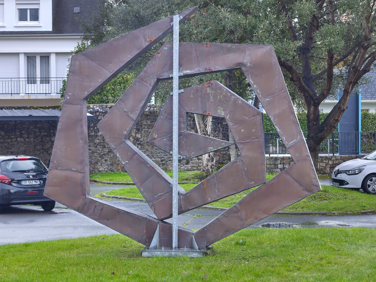 Soleil Celte. Sculpture de Georges Delahaie, en feuilles cuivre sur ossature d'acier, 1972. Face arrière, côté ouest. L'ossature a été modifiée.Immatriculation