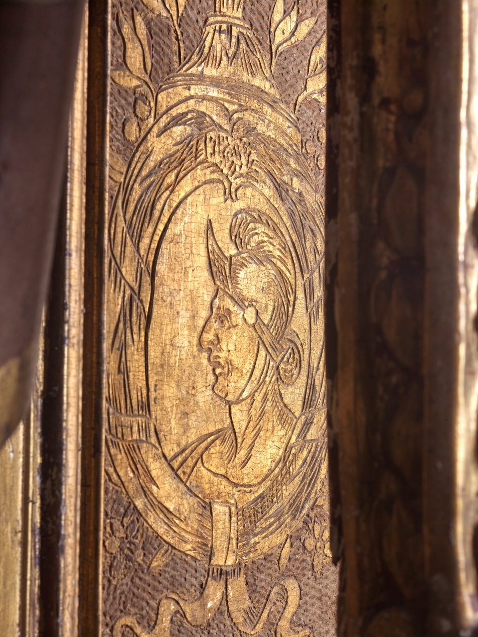 Retable. Détail du travail des fonds à la dorure. Figure de soldatImmatriculation