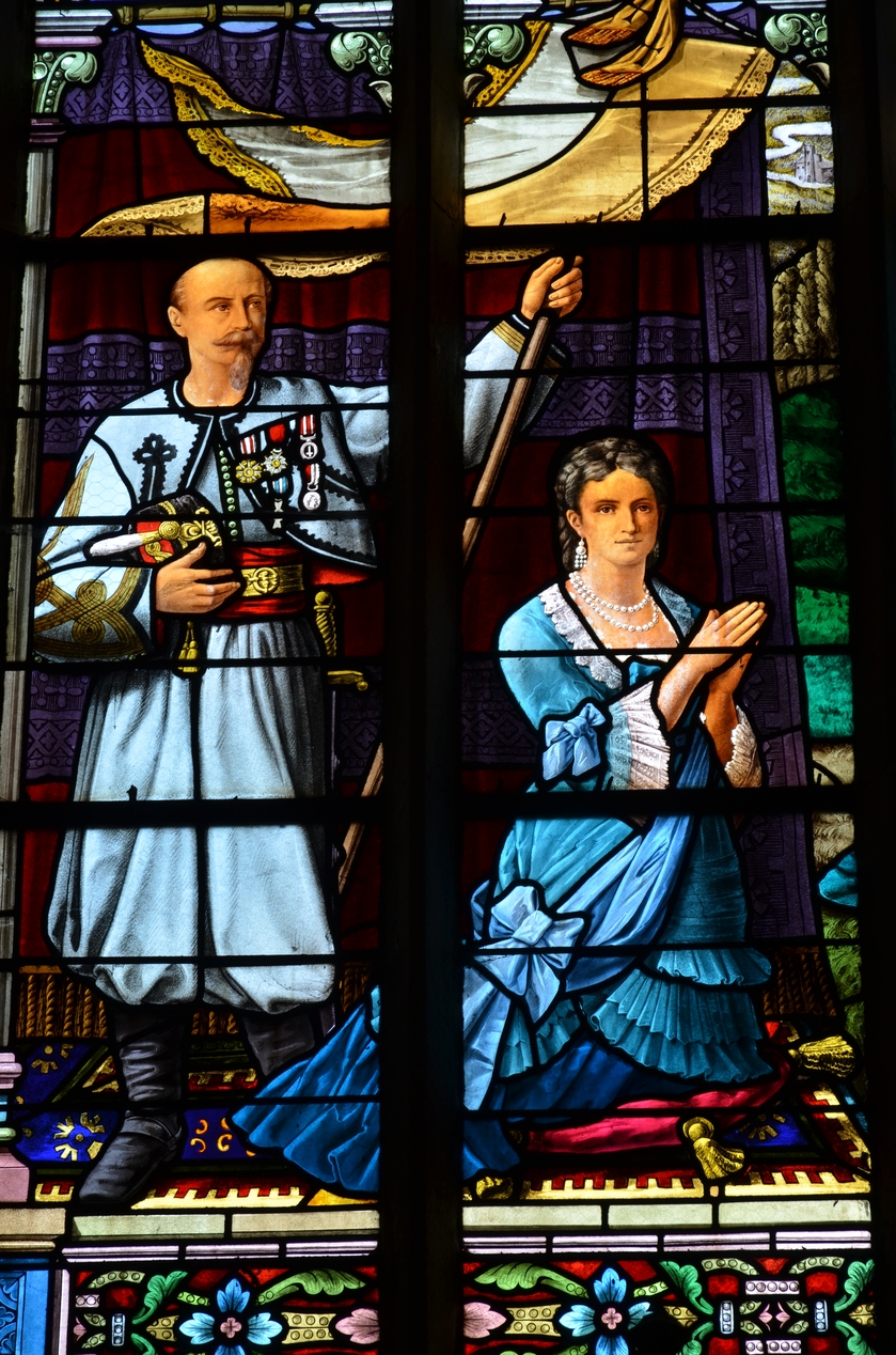 Le comte Paul de Saisy de Kerampuil, en commandant des zouaves pontificaux, portant les décorations de l'ordre de Pie IX, la légion d'honneur, la médaille de Castelfidardo et la croix de Mentana. Agenouillée, son épouse Elisabeth du Plessix de Grénédan (Eglise Saint-Samson, Illifaut)Immatriculation